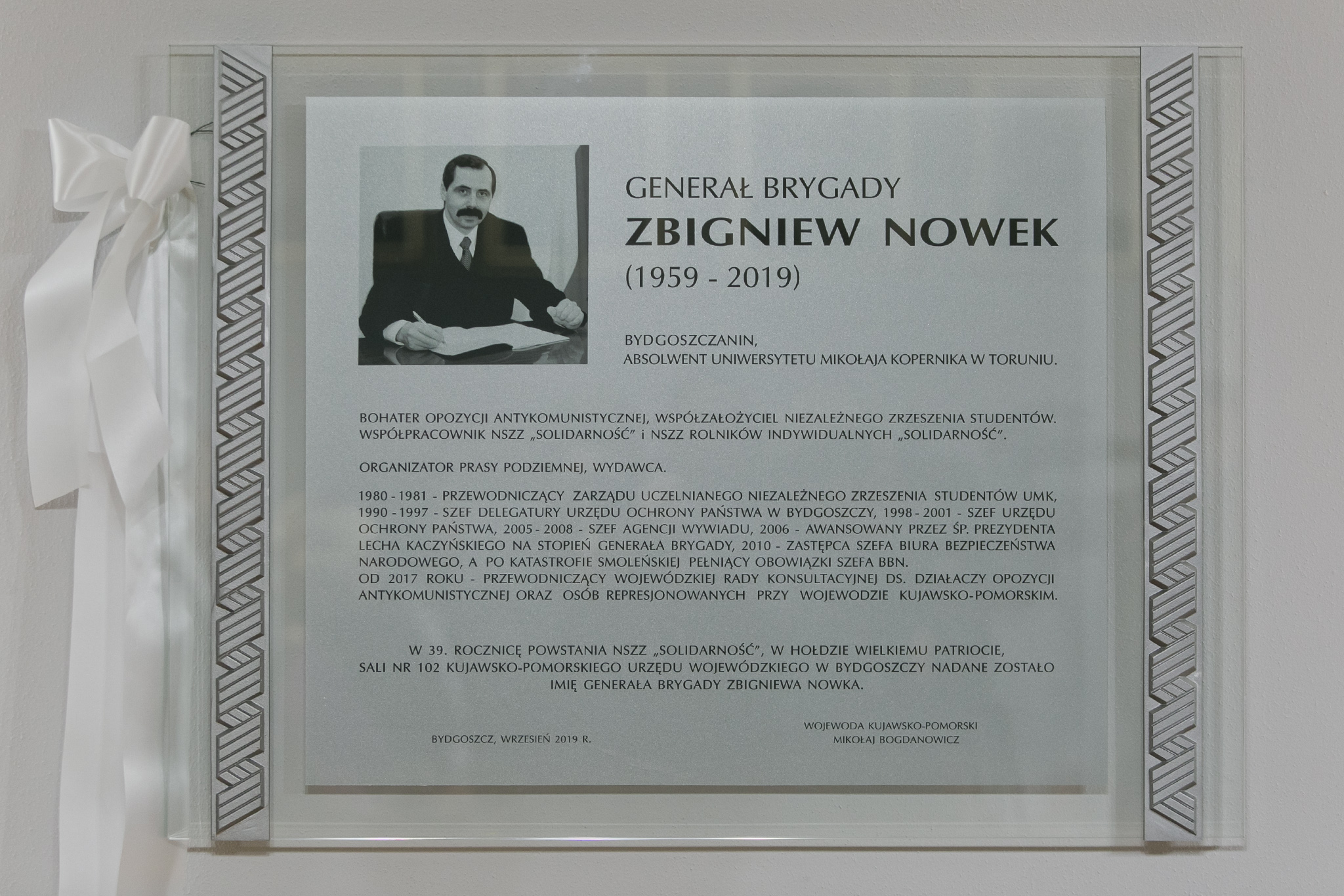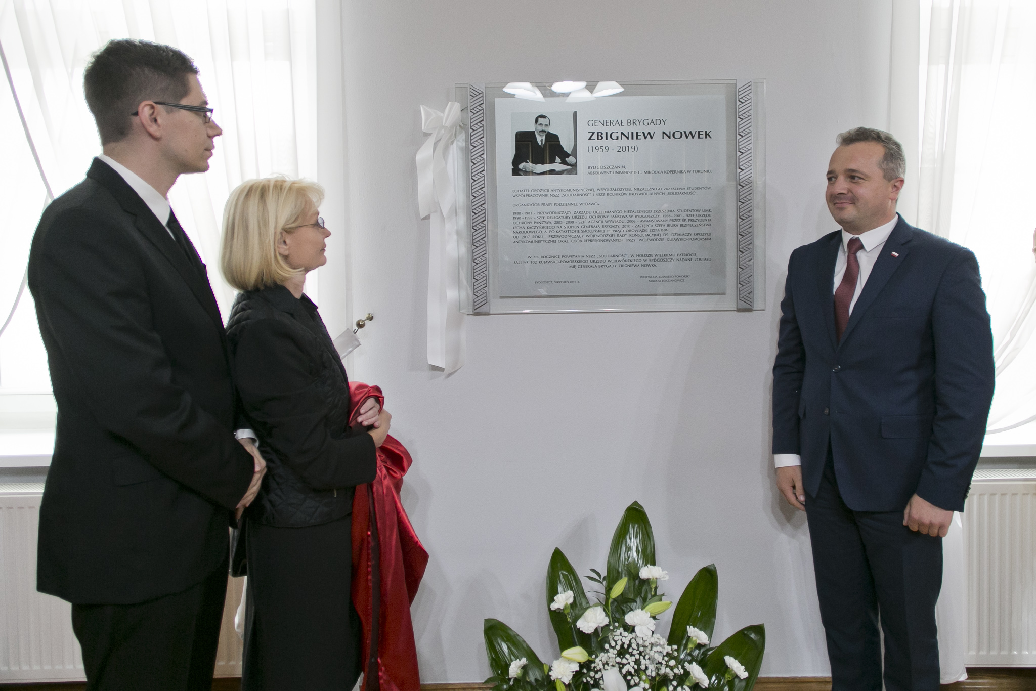 Aktu odsłonięcia pamiątkowej tablicy dokonali Wojewoda Kujawsko-Pomorski Mikołaj Bogdanowicz oraz Anna i Krzysztof Nowek – żona i syn Generała. Tablicę poświęcił ordynariusz diecezji bydgoskiej bp Jan Tyrawa.