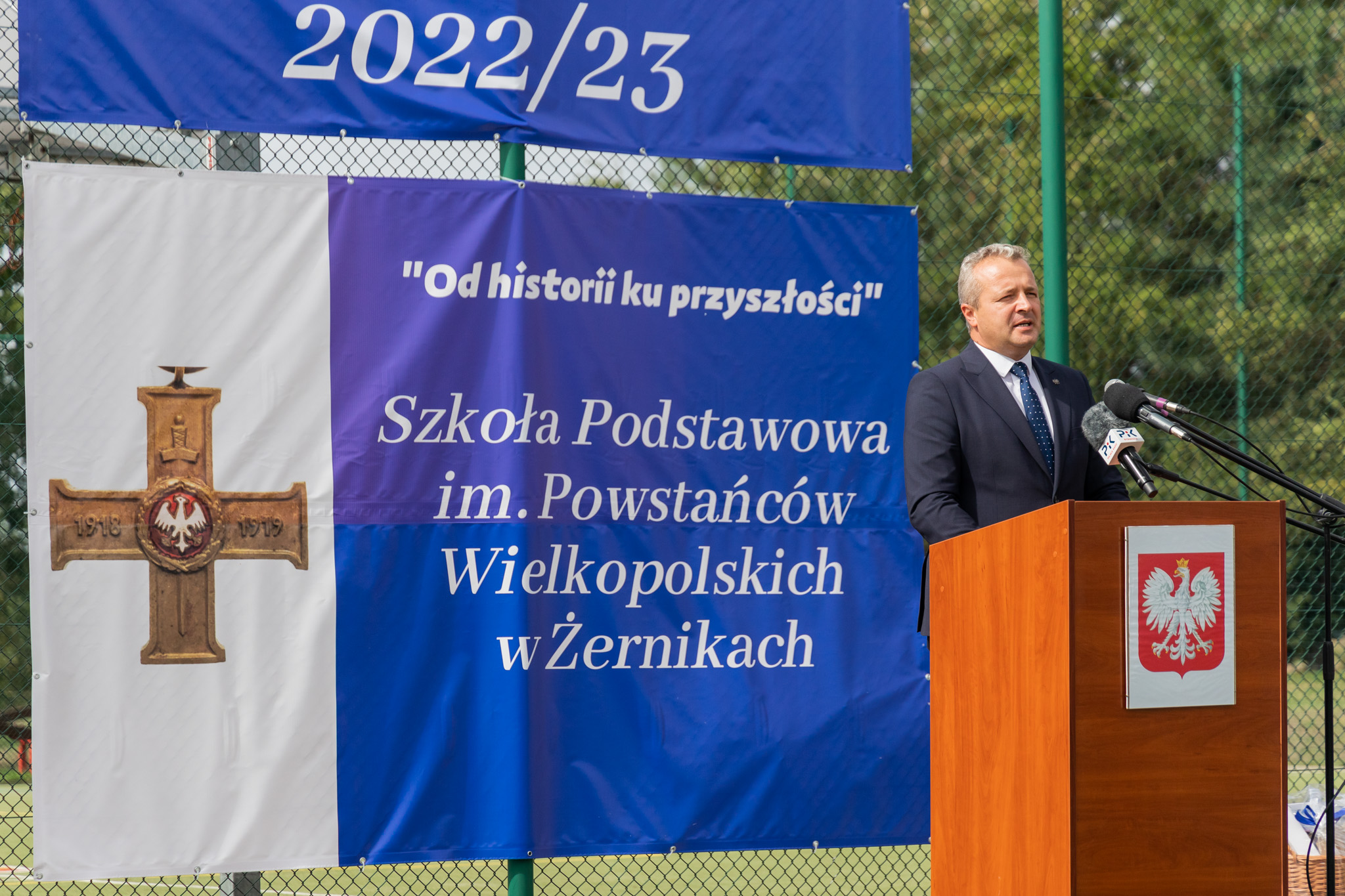 Wojewoda Mikołaj Bogdanowicz wziął dziś udział w uroczystym rozpoczęciu roku szkolnego 2022/23 w Szkole Podstawowej im. Powstańców Wielkopolskich w Żernikach. Podczas uroczystości otwarto nową część budynku szkolnego, którego budowa została dofinansowana kwotą 900 tys. złotych z Rządowego Funduszu Inwestycji Lokalnych.