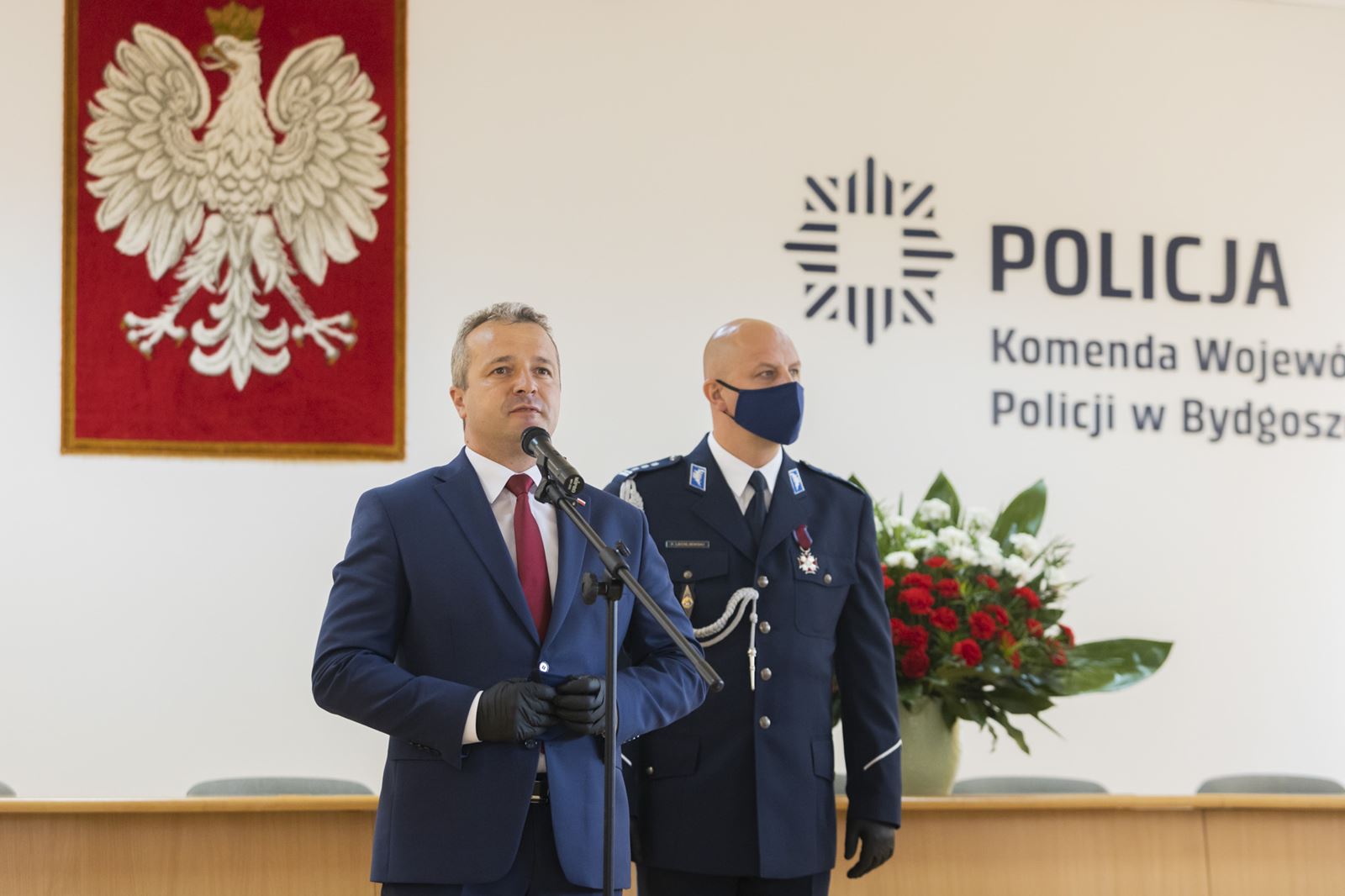 W dalszej części uroczystości głos zabrał Wojewoda Kujawsko-Pomorski Mikołaj Bogdanowicz, który w sposób szczególny podziękował policjantom i pracownikom Policji za pracę w czasie pandemii.