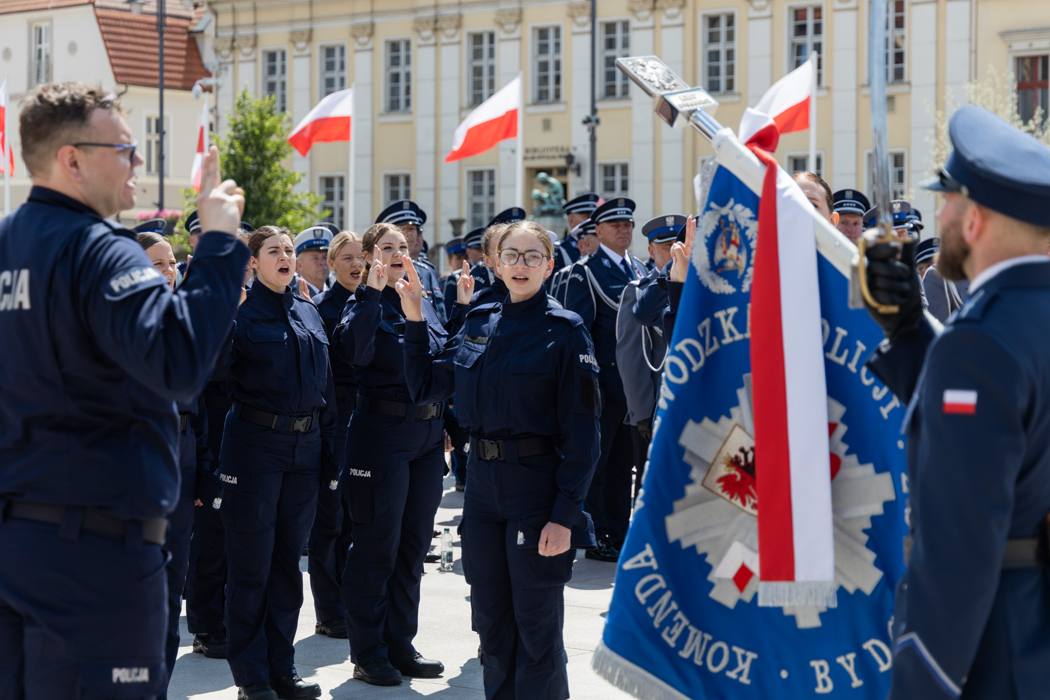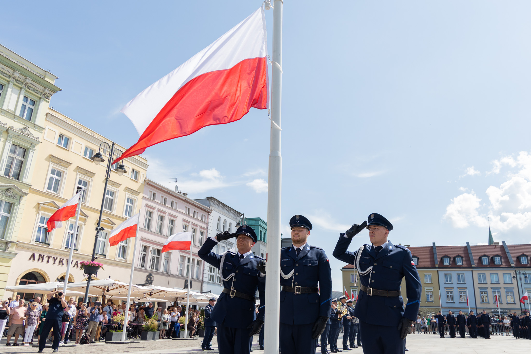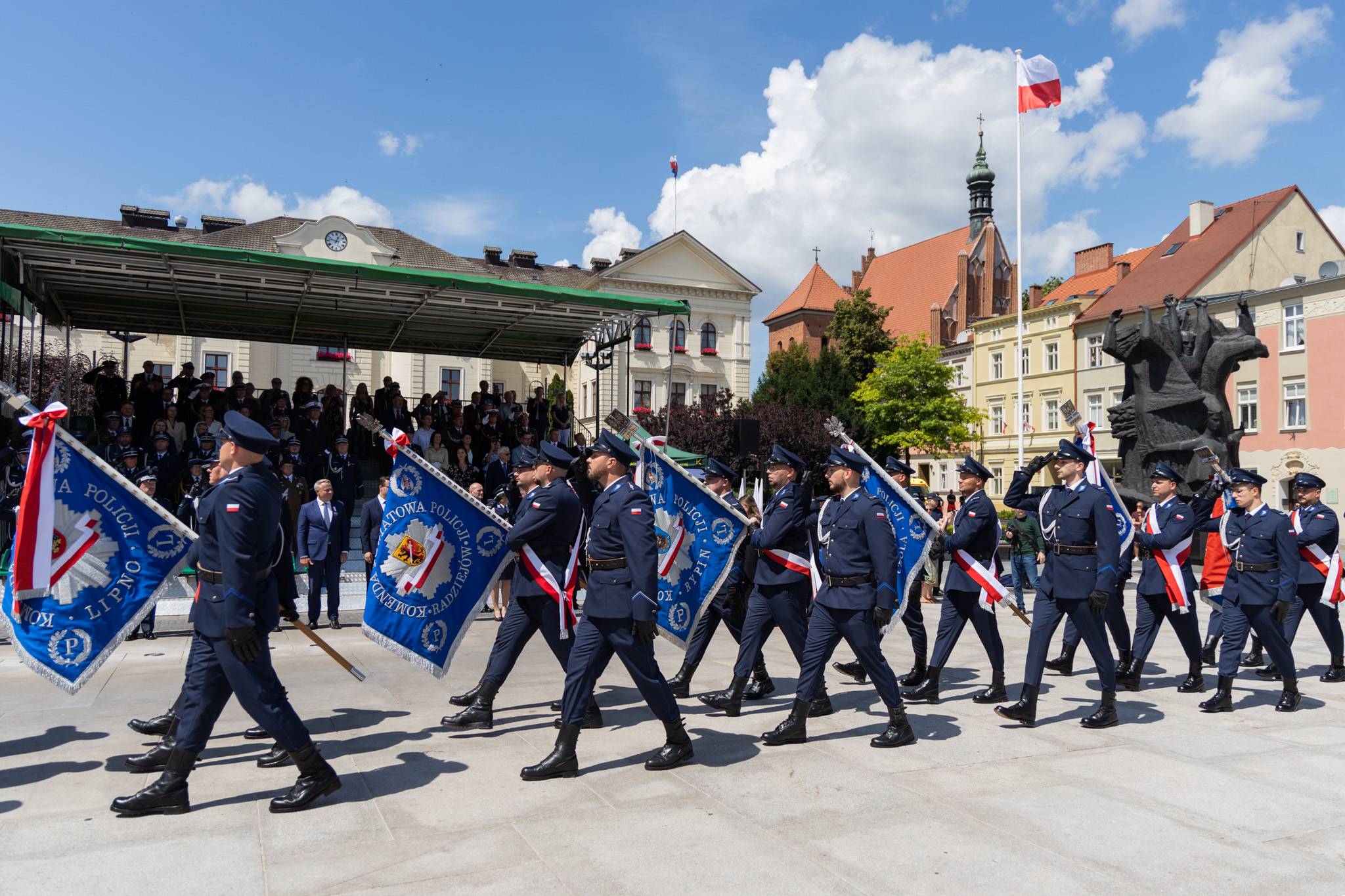 Uroczyste obchody Święta Policji w Bydgoszczy rozpoczęły się podniesieniem flagi RP, odśpiewaniem hymnu państwowego oraz upamiętnieniem minutą ciszy policjantów poległych w służbie.