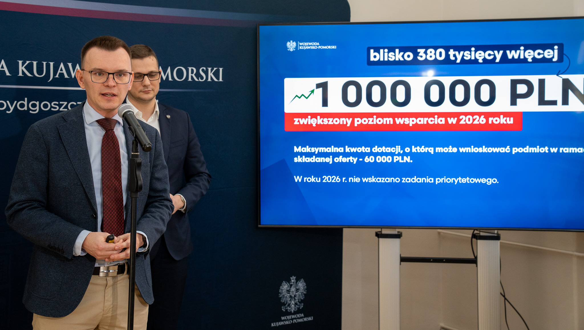Podczas dzisiejszej konferencji prasowej Wojewoda Kujawsko-Pomorski Michał Sztybel wraz z Dyrektorem Wydziału Polityki Społecznej Przemysławem Biegańskim oraz Pełnomocnikiem ds. Współpracy z NGO Ireneuszem Nitkiewiczem, ogłosił otwarcie konkursu ofert dla organizacji pozarządowych. Budżet na wsparcie projektów z zakresu pomocy społecznej wzrósł do miliona złotych.