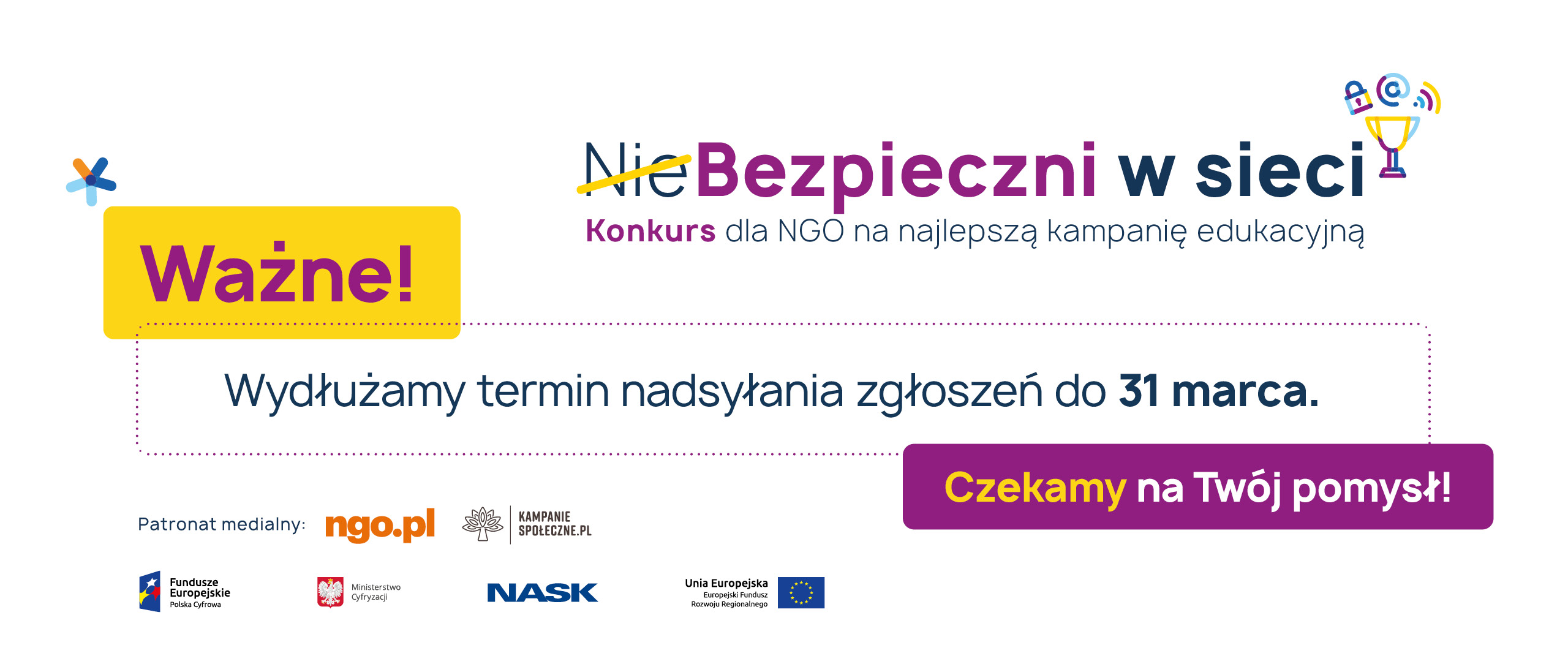 Halo, halo, czy są tu jakieś organizacje pozarządowe? W związku z ostatnimi wydarzeniami – macie jeszcze nie kilka dni, prawie dwa tygodnie na zgłoszenie pomysłu do konkursu „NieBezpieczni w sieci”. Wasz pomysł i nasze wsparcie - to musi się udać!