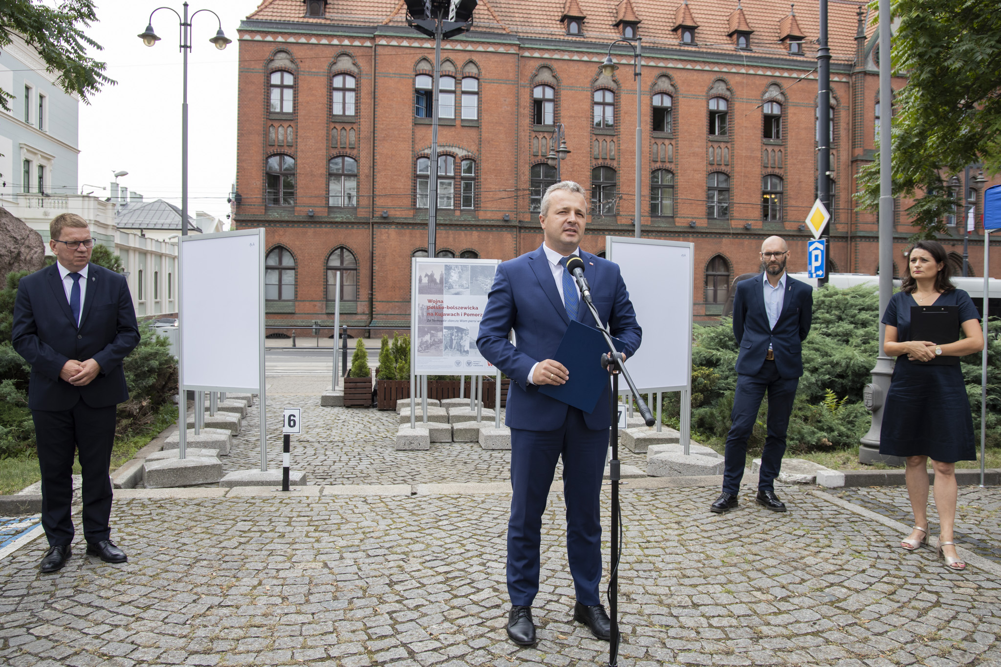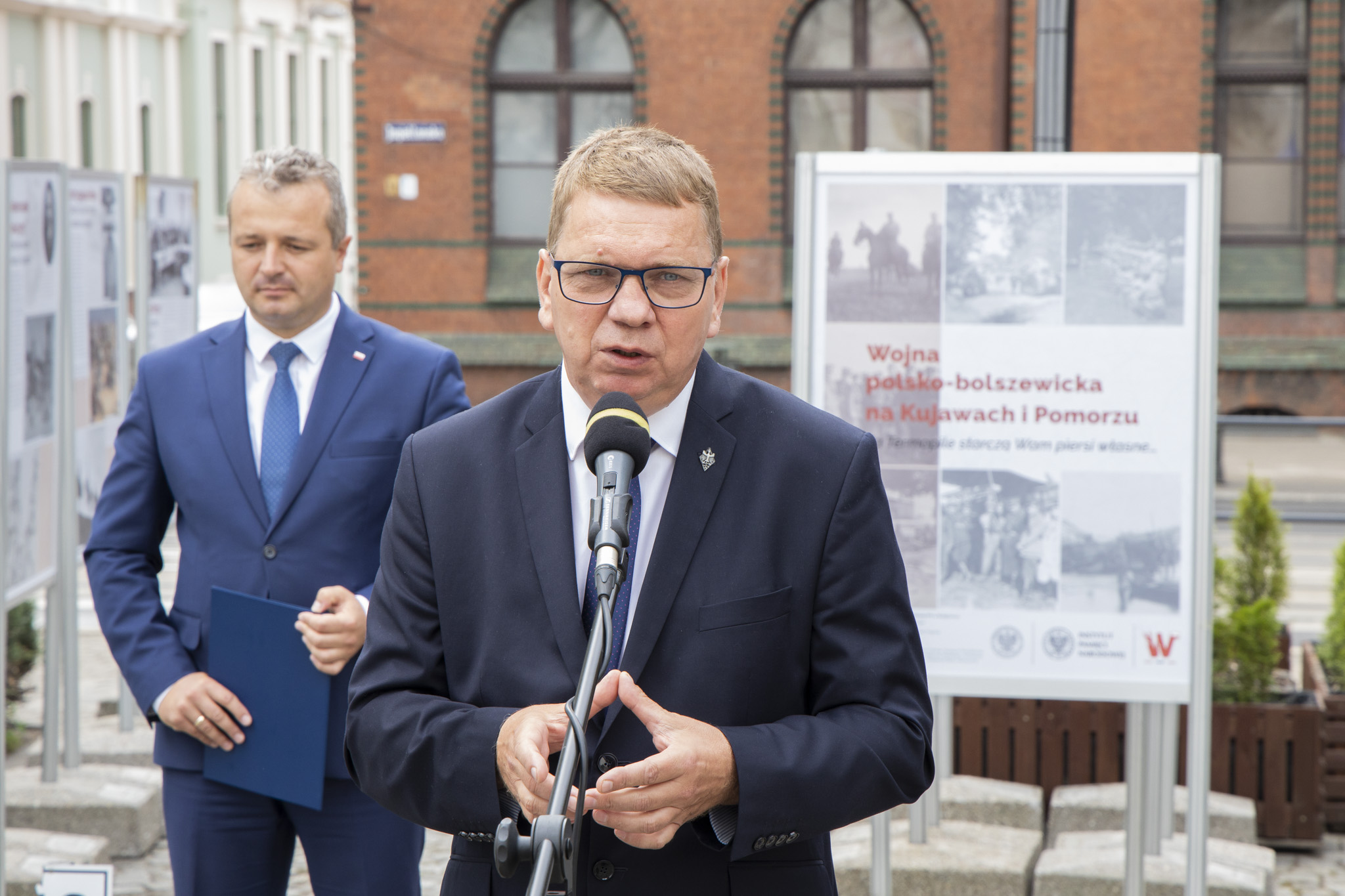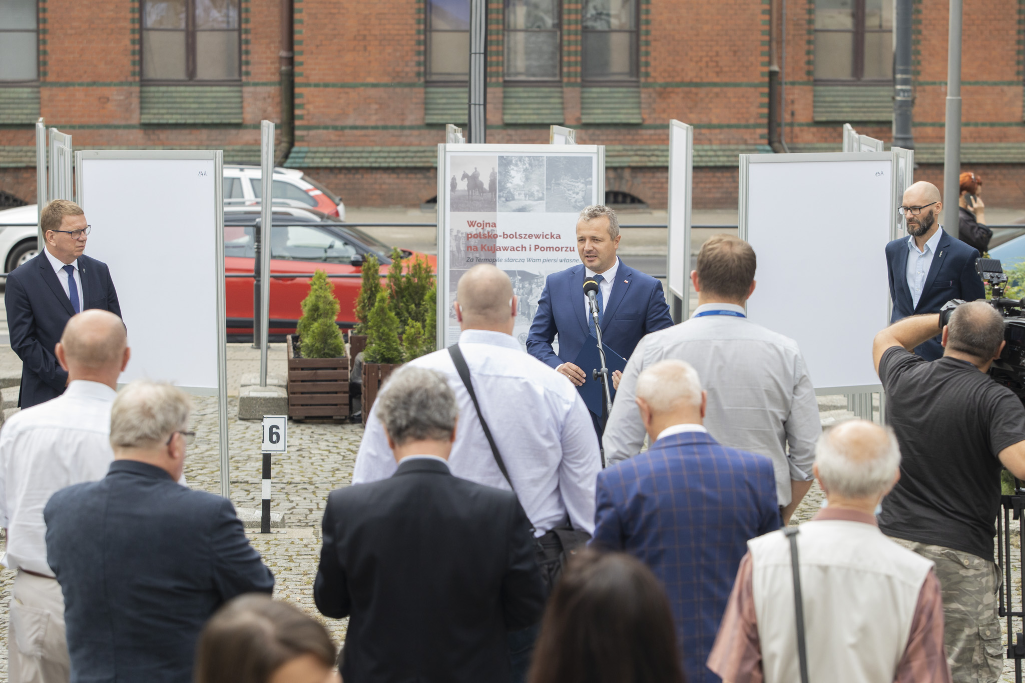 Dziś przed gmachem głównym Kujawsko-Pomorskiego Urzędu Wojewódzkiego została otwarta wystawa „Wojna polsko-bolszewicka na Kujawach i Pomorzu. Za Termopile starczą Wam piersi własne.” W uroczystości wzięli udział m.in. Wojewoda Kujawsko-Pomorski Mikołaj Bogdanowicz, Dyrektor Oddziału Instytutu Pamięci Narodowej w Gdańsku prof. dr hab. Mirosław Golon oraz twórcy wystawy.
