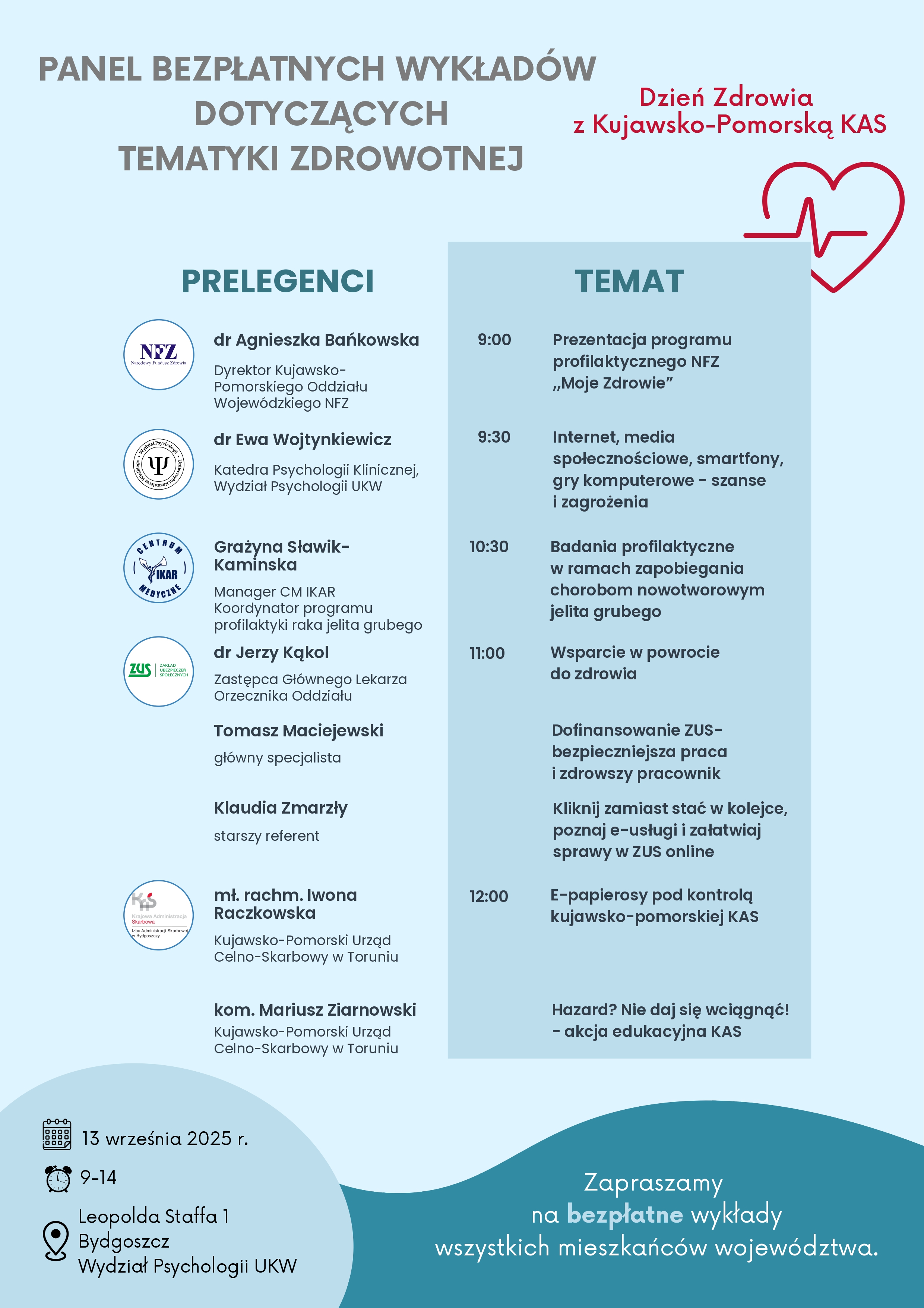 Wydarzenie odbędzie się w godzinach 9:00- 14:00 na terenie Wydziału Psychologii UKW w Bydgoszczy, przy ul. Leopolda Staffa 1. Mieszkańcy będą mogli skorzystać z szerokiej oferty badań profilaktycznych, porad specjalistów oraz paneli edukacyjnych dotyczących zdrowego stylu życia.