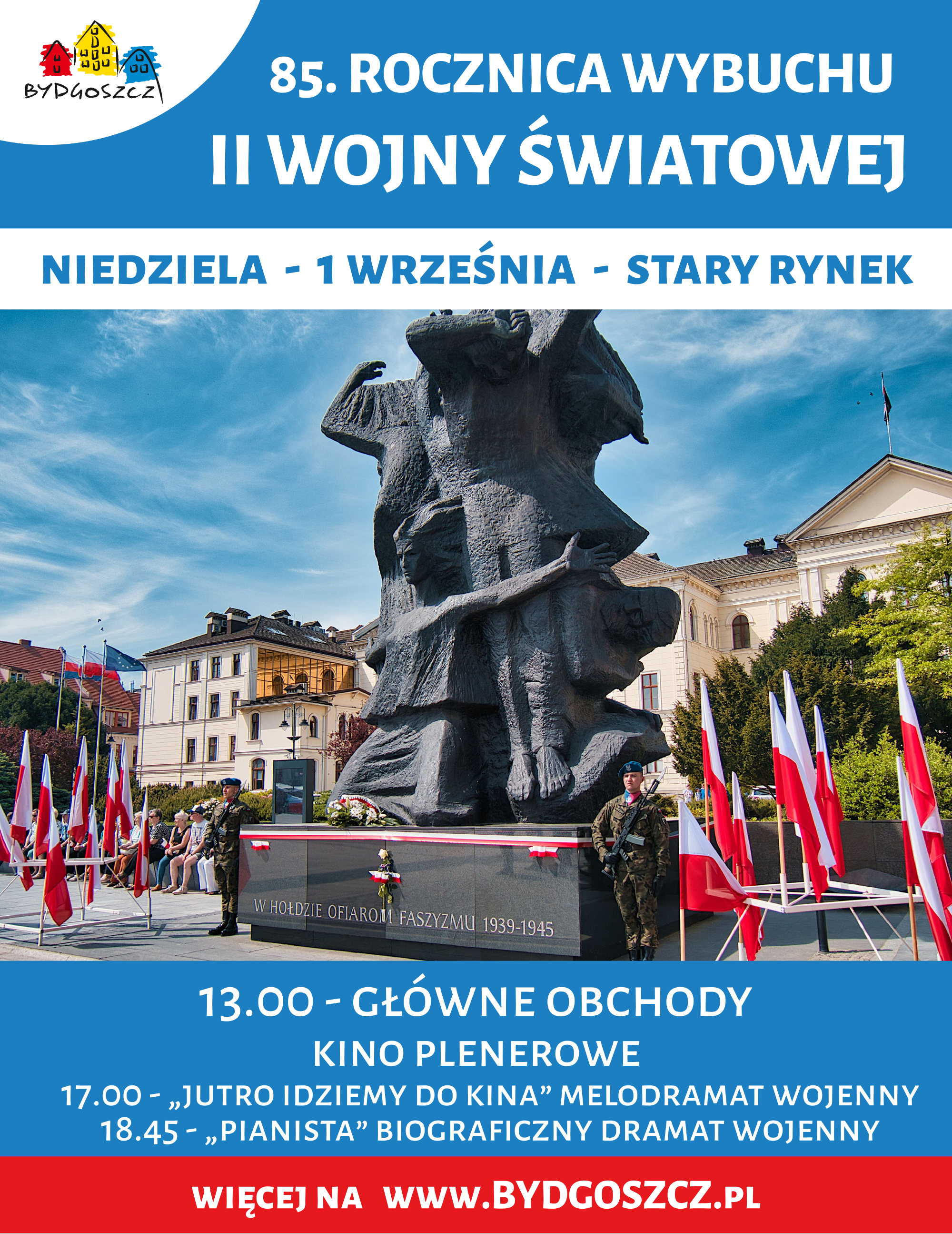 Wojewoda Kujawsko-Pomorski Michał Sztybel wspólnie z Prezydentem Miasta Bydgoszczy Rafałem Bruskim oraz Szefem Inspektoratu Wsparcia Sił Zbrojnych w Bydgoszczy zapraszają na obchody 85. rocznicy wybuchu II wojny światowej, które odbędą się w Bydgoszczy.