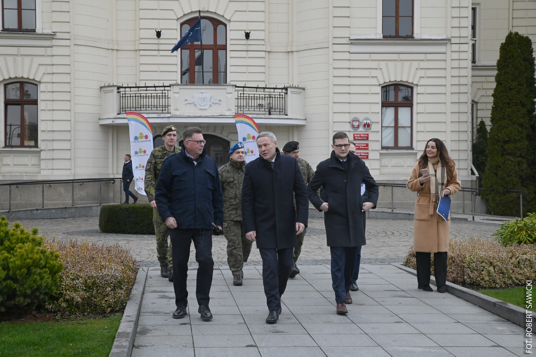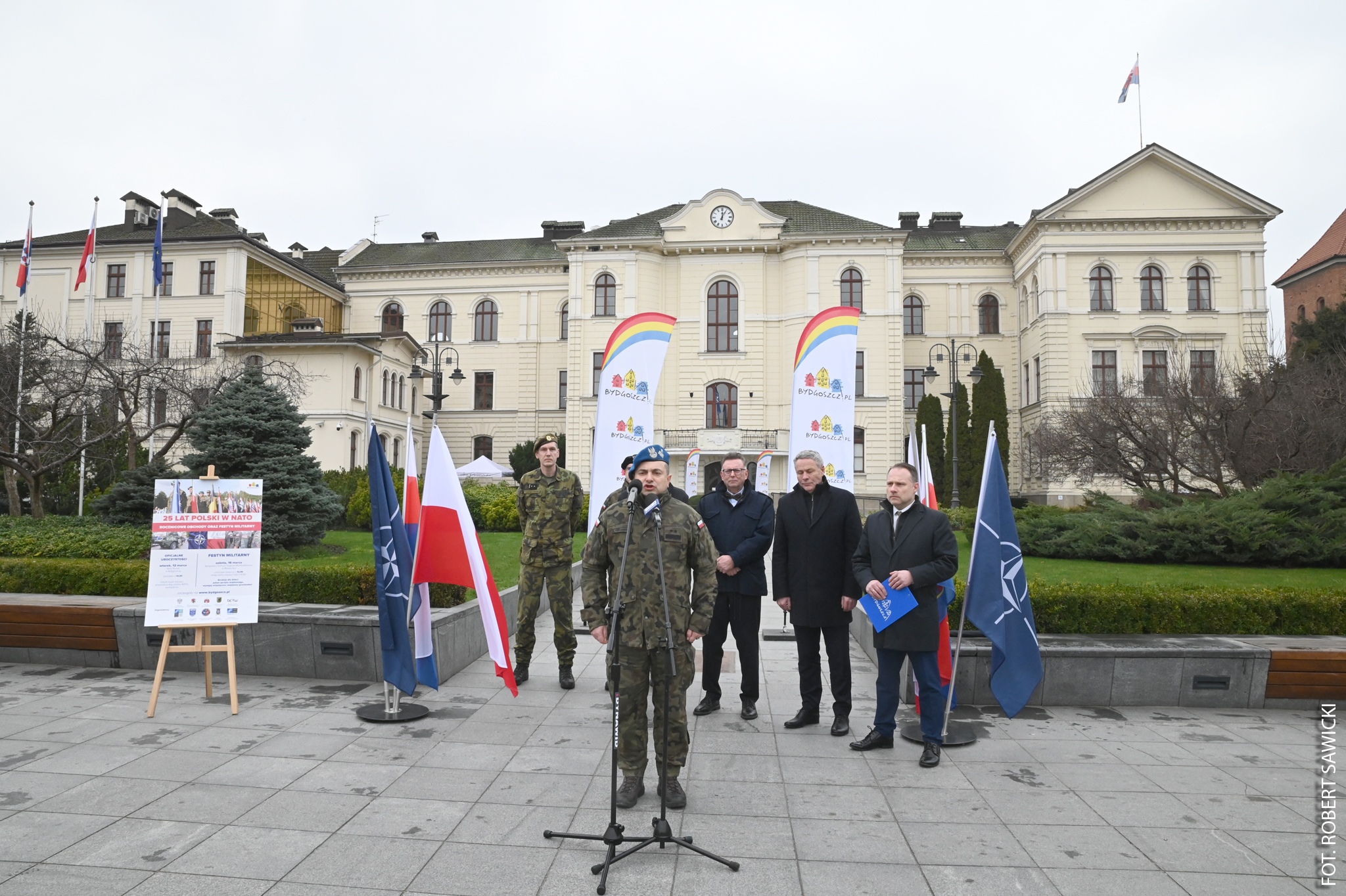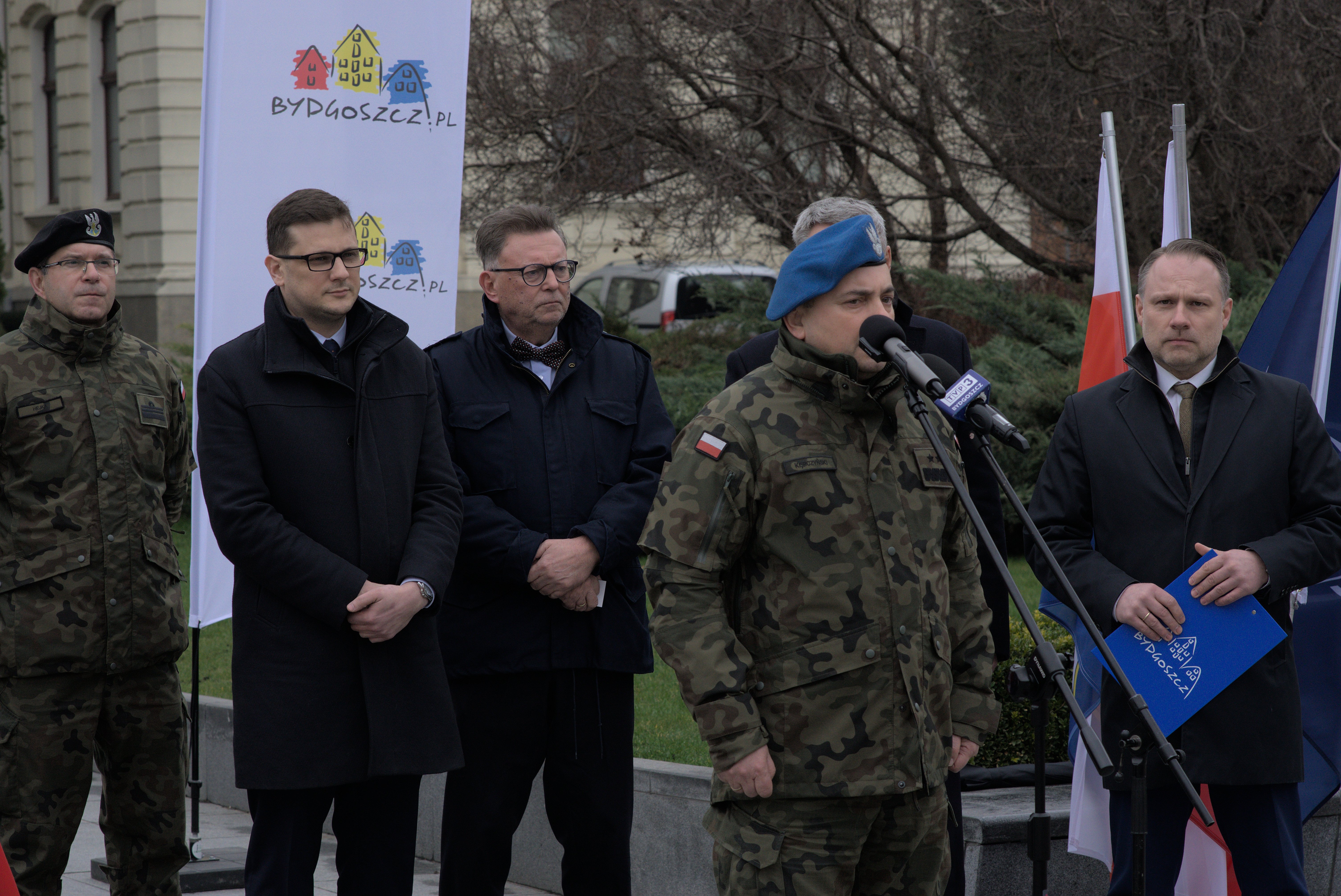 W dzisiejszej konferencji prasowej zorganizowanej przed Ratuszem Miejskim w Bydgoszczy wzięli udział Wojewoda Kujawsko – Pomorski Michał Sztybel, Prezydent Miasta Bydgoszczy Rafał Bruski, Wicemarszałek Województwa Kujawsko-Pomorskiego Zbigniew Ostrowski, Szef Inspektoratu Wsparcia Sił Zbrojnych gen. dyw. Artur Kępczyński, komandor porucznik Sławomir Hejkasz, Dowódca 3. Batalionu Łączności NATO ppłk Pavel Matuszek oraz Zastępca Prezydenta Miasta Bydgoszczy Łukasz Krupa.