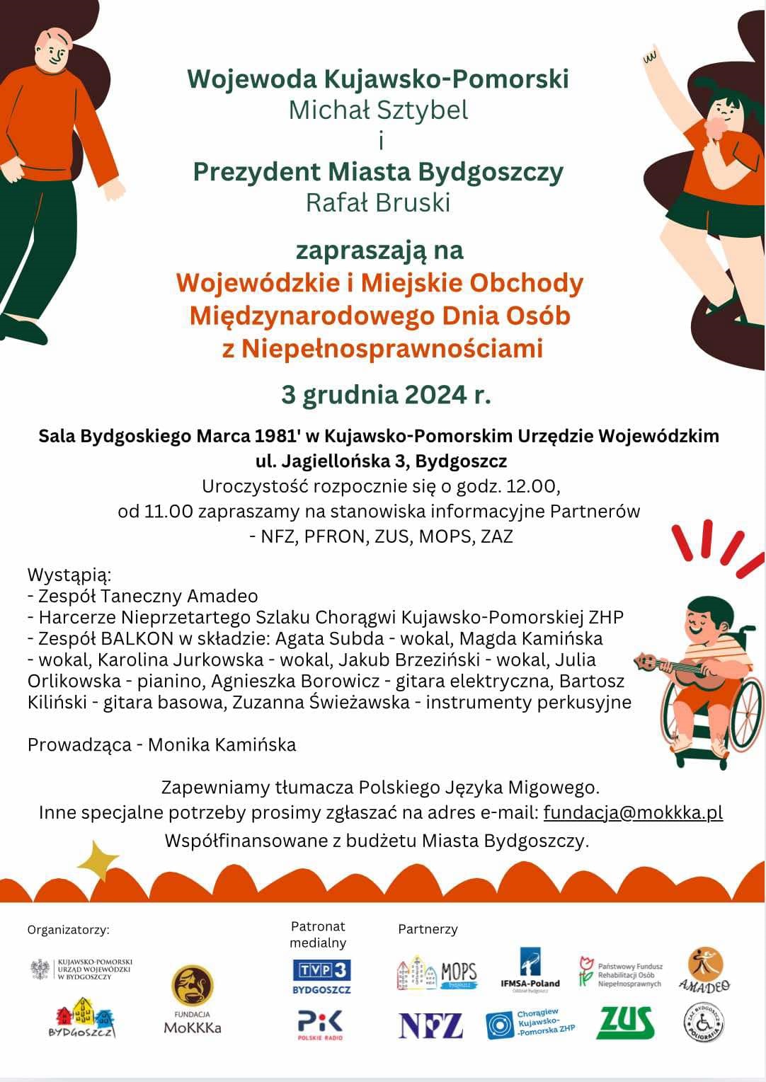Już 3 grudnia będziemy obchodzić Międzynarodowy Dzień Osób z Niepełnosprawnościami. Tego dnia w sali Bydgoskiego Marca 1981’ w Kujawsko-Pomorskim Urzędzie Wojewódzkim odbędą się Wojewódzkie i Miejskie Obchody Międzynarodowego Dnia Osób z Niepełnosprawnościami.