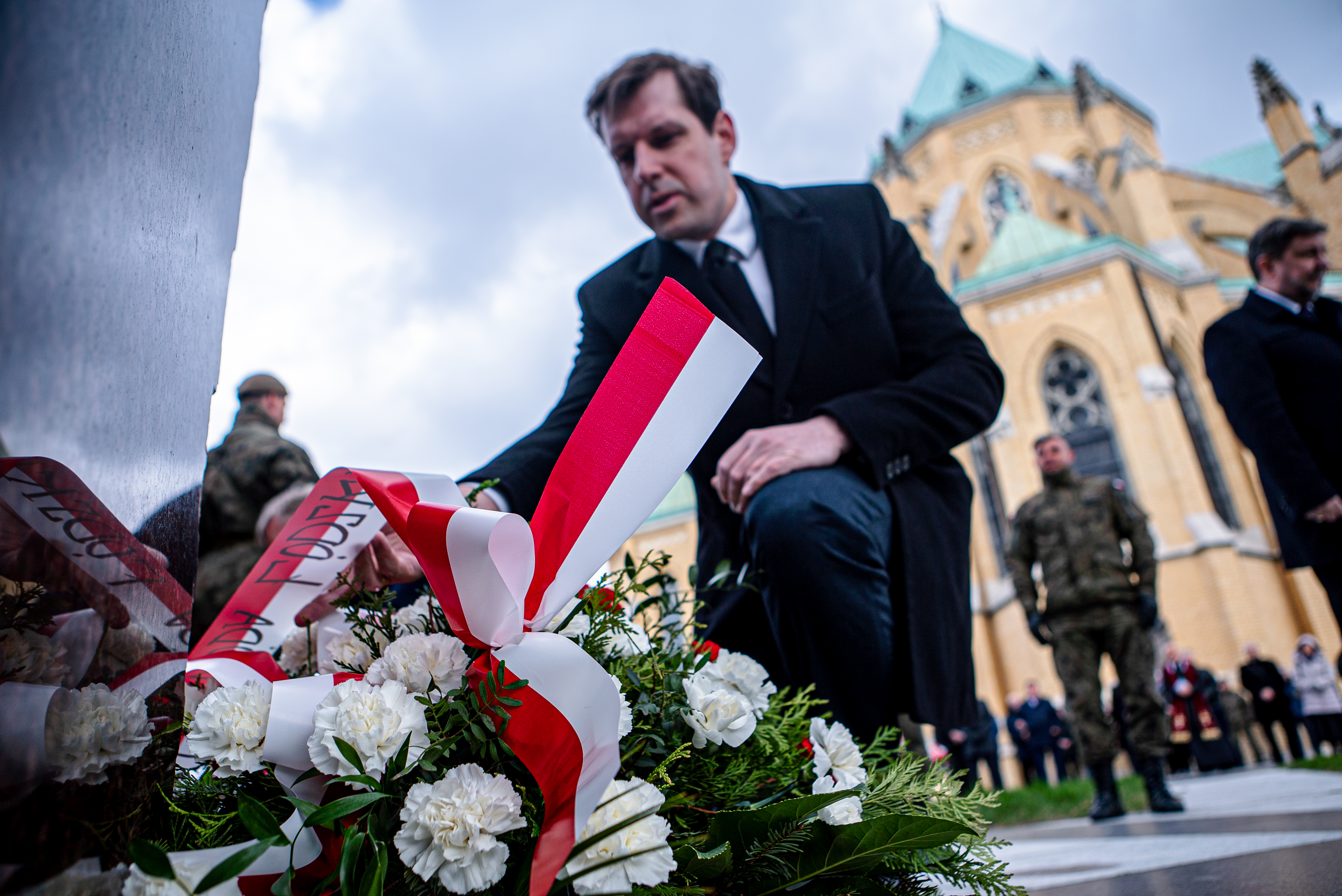 Wojewoda łódzki Tobiasz Bocheński, marszałek województwa łódzkiego Grzegorz Schreiber oraz przewodniczący NSZZ „Solidarność” Ziemi Łódzkiej Waldemar Krenc złożyli wieńce przed Pomnikiem Ofiar Katastrofy Smoleńskiej przy bazylice archikatedralnej w Łodzi.