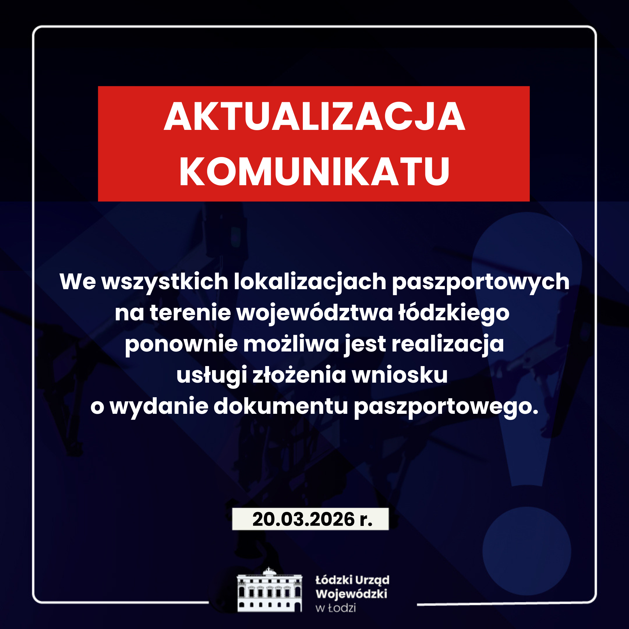 Aktualizacja komunikatu - we wszystkich lokalizacjach paszportowych na terenie województwa łódzkiego ponownie możliwa jest realizacja usługi złożenia wniosku o wydanie dokumentu paszportowego.