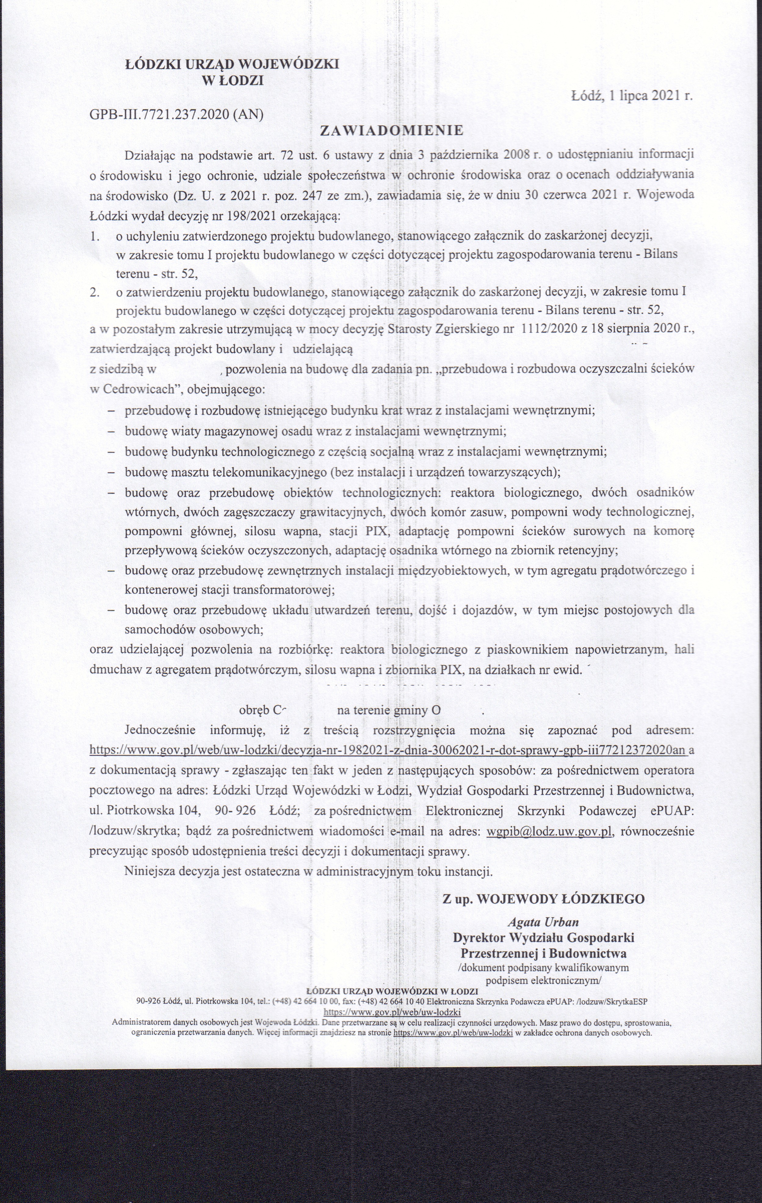 Decyzja Wojewody Łódzkiego nr 198/2021 z dnia 30.06.2021 r. znak: GPB-III.7721.237.2020.AN wydana po rozpatrzeniu odwołania od decyzji Starosty Zgierskiego nr 1112/2020 z 18 sierpnia 2020 r., zatwierdzającej projekt budowlany i udzielającej „Ozorkowskiemu Przedsiębiorstwu Komunalnemu” Sp. z o. o. z siedzibą w Ozorkowie, pozwolenia na budowę dla zadania pn. „przebudowa i rozbudowa oczyszczalni ścieków w Cedrowicach”
