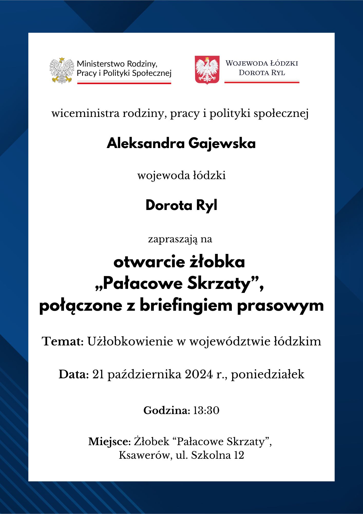 wiceministra rodziny, pracy i polityki społecznej Aleksandra Gajewska oraz wojewoda łódzki Dorota Ryl zapraszają na otwarcie żłobka „Pałacowe Skrzaty”, połączone z briefingiem prasowym.