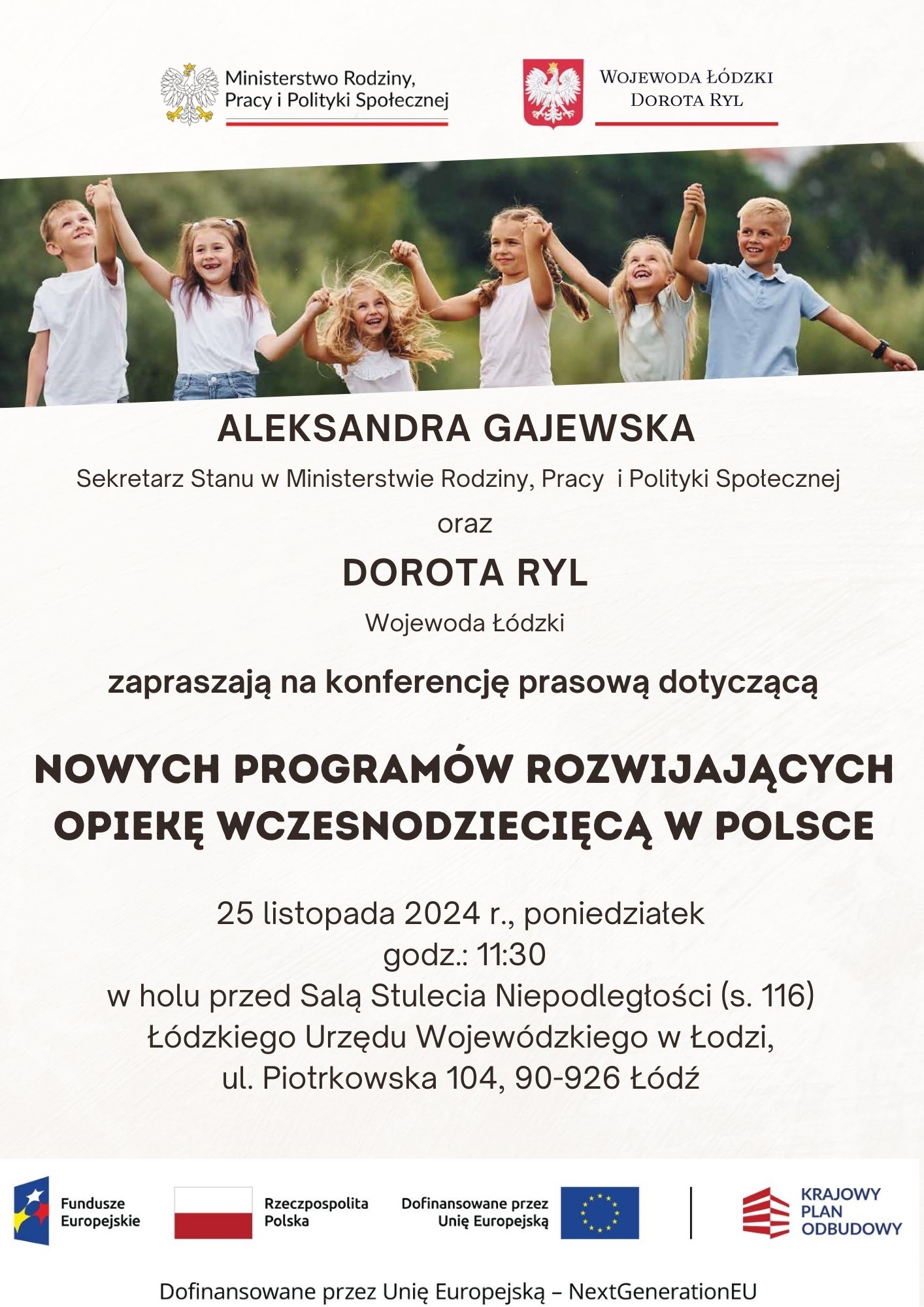 Aleksandra Gajewska – Sekretarz Stanu w Ministerstwie Rodziny, Pracy i Polityki Społecznej oraz Dorota Ryl – Wojewoda Łódzki zapraszają na konferencję prasową dotyczącą nowych programów rozwijających opiekę wczesnodziecięcą w Polsce.