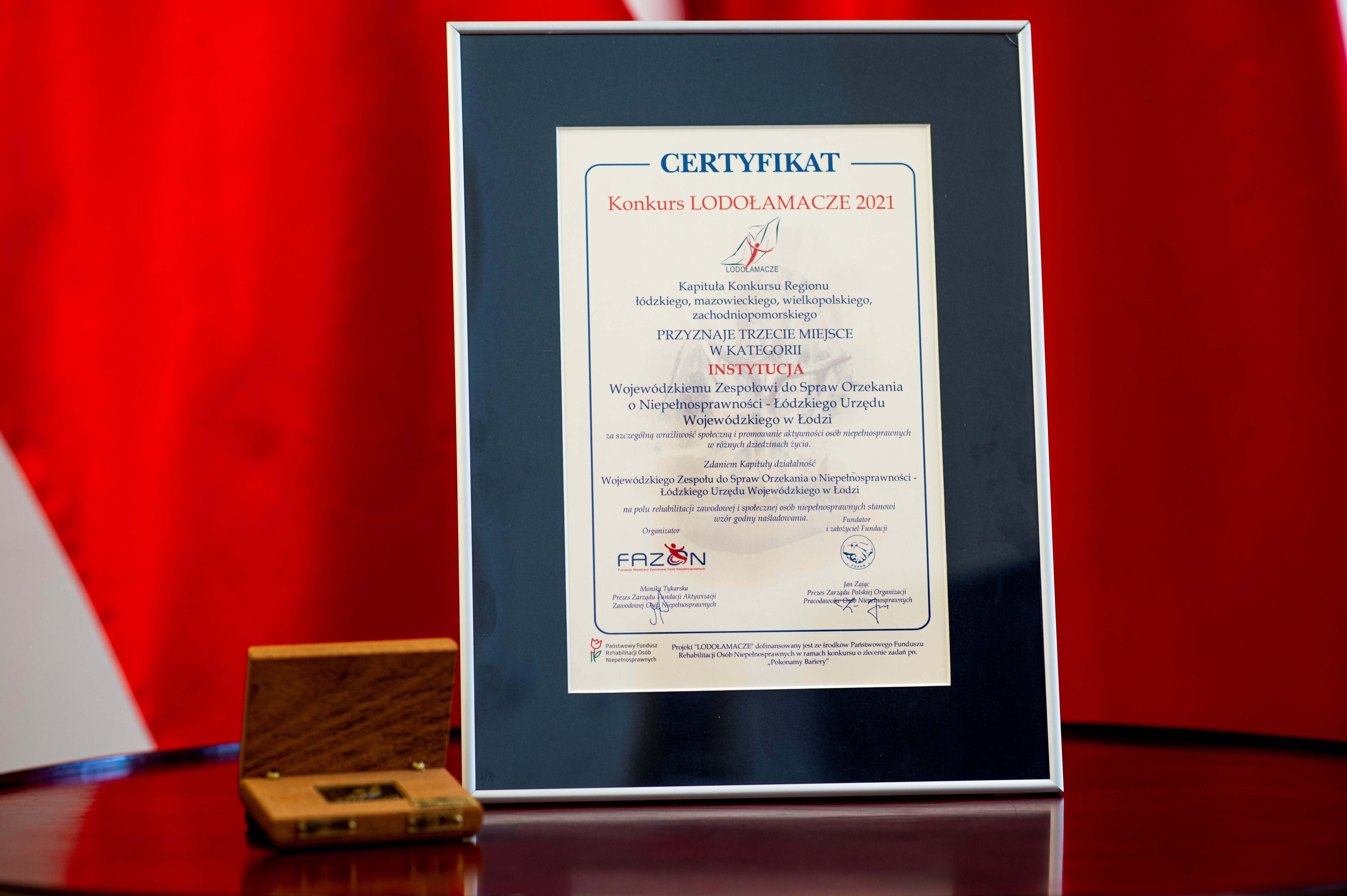 W tym roku kapituła konkursu za szczególną wrażliwość społeczną i promowanie aktywność osób niepełnosprawnych w różnych dziedzinach życia przyznała trzecie miejsce Wojewódzkiemu Zespołowi do Spraw Orzekania o Niepełnosprawności – Łódzkiego Urzędu Wojewódzkiego w Łodzi. Zdaniem kapituły nasza działalność na polu rehabilitacji zawodowej i społecznej osób niepełnosprawnych ,,stanowi wzór godny naśladowania”.