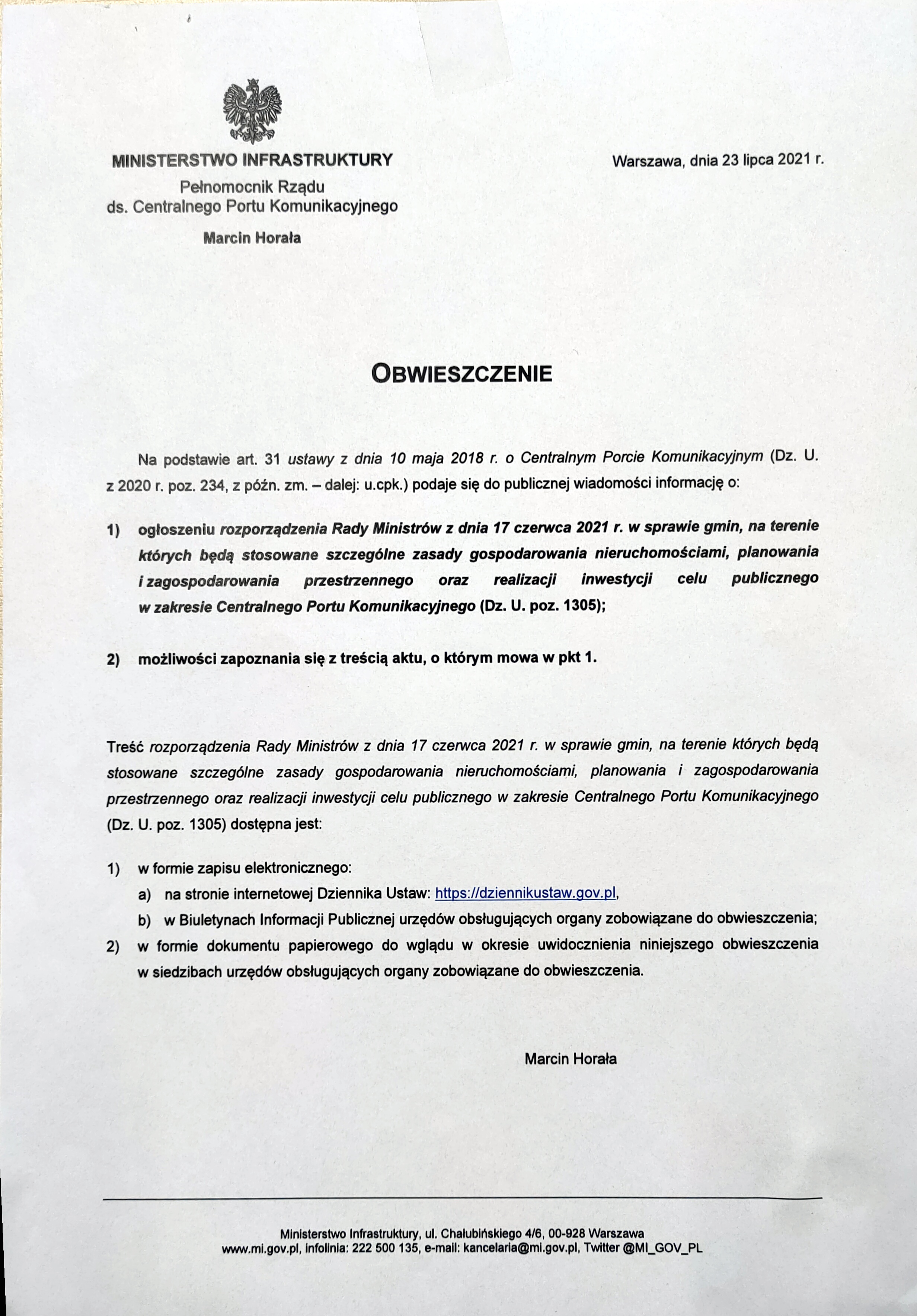 Obwieszczenie Pełnomocnika Rządu ds. Centralnego Portu Komunikacyjnego, w związku z ogłoszeniem rozporządzenia Rady Ministrów z dnia 17 czerwca 2021 r., w sprawie gmin, na terenie których będą stosowane szczególne zasady gospodarowania nieruchomościami, planowania i zagospodarowania przestrzennego oraz realizacji Inwestycji celu publicznego w zakresie Centralnego Portu Komunikacyjnego.