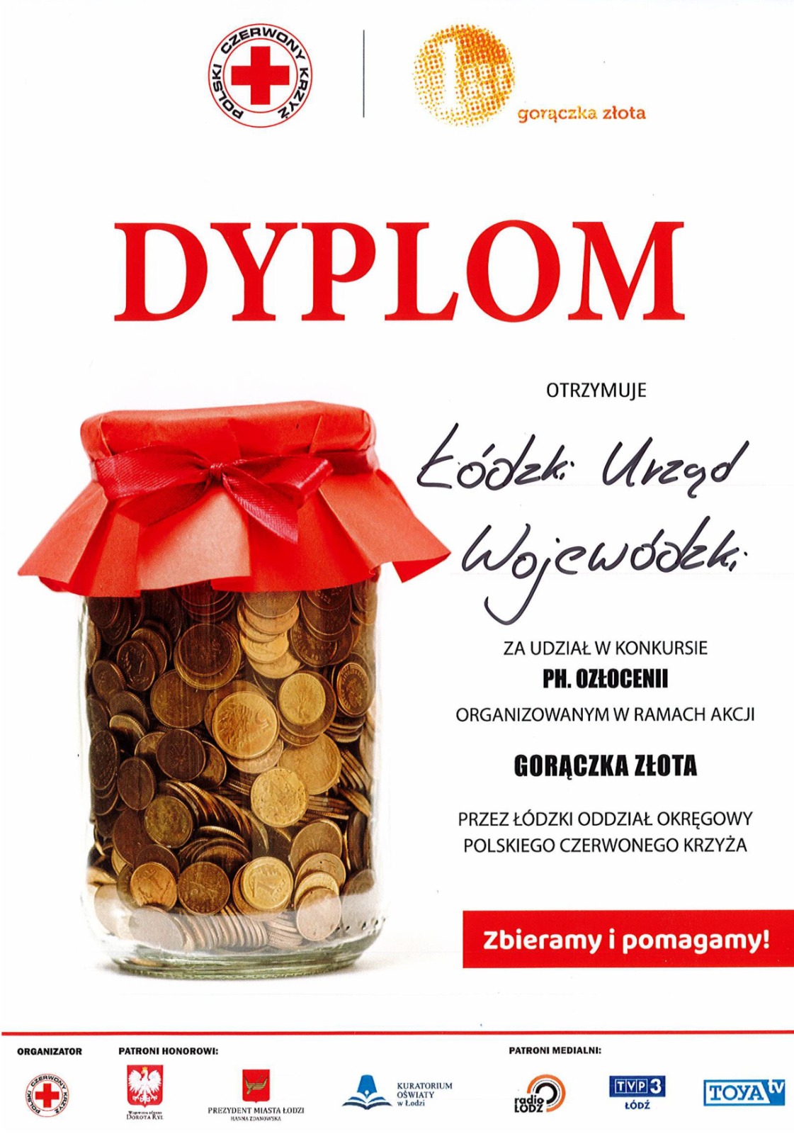 Łódzki Urząd Wojewódzki dołączył do ogólnopolskiej akcji charytatywnej - 24. edycji „Gorączki Złota”, organizowanej przez Polski Czerwony Krzyż. W tym roku pracownicy ŁUW wzięli udział w konkursie „Ozłoceni”, którzy towarzyszy zbiórce drobnych monet na rzecz najbardziej potrzebujących.