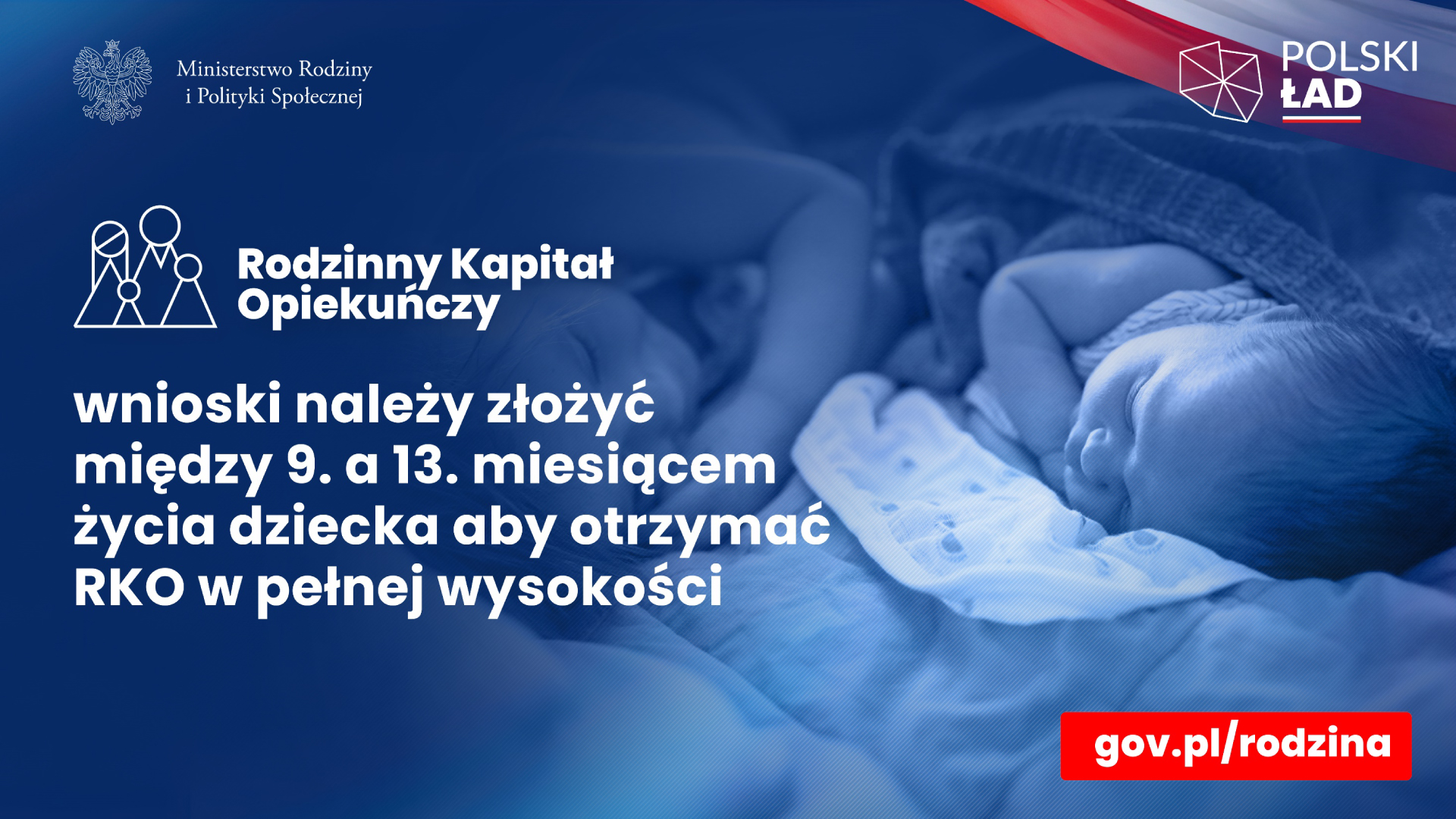 Wniosek o rodzinny kapitał opiekuńczy najlepiej złożyć między 9. a 13. miesiącem życia dziecka. Wtedy świadczenie będzie przysługiwało w pełnej wysokości, od miesiąca, w którym dziecko skończy rok.