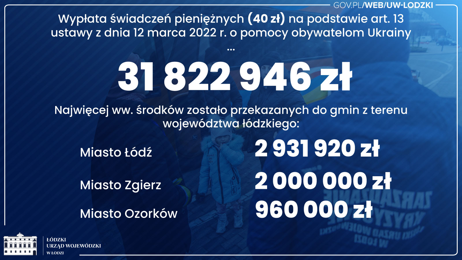 W ramach tych środków wojewoda łódzki przekazał samorządom blisko 32 mln zł na wypłatę świadczeń dla osób, które zapewniły na własny koszt zakwaterowanie i wyżywienie uchodźcom z Ukrainy. Największe wsparcie w tym zakresie otrzymały: