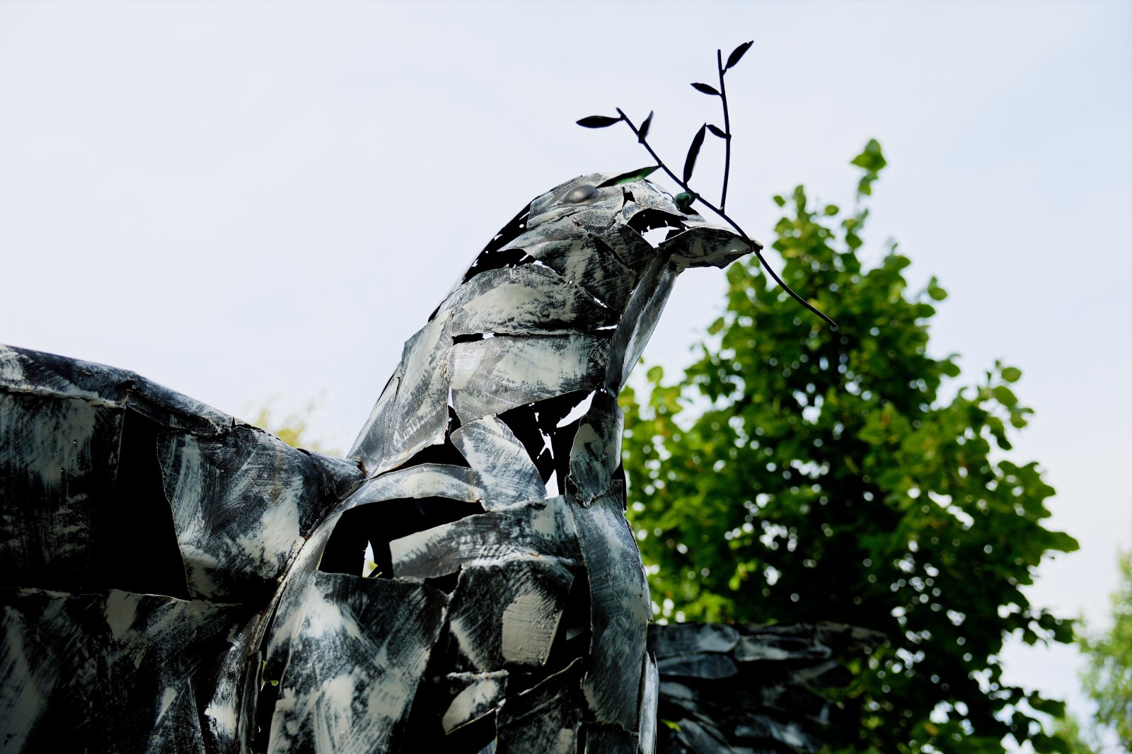 Rzeźba, którą Jessica Cheng wykonała w czasie pobytu na ubiegłorocznym, Międzynarodowym Forum Pokoju w Łodzi, skłania nas do refleksji nad więzią między ludzkością a naturą oraz nad pilną potrzebą ochrony wspólnego świata. Rzeźba o wymiarach 250 × 350 × 100 cm została stworzona z materiałów pochodzących z recyklingu, zawierając elementy takie jak drzwi samochodowe oraz inne ponownie wykorzystane części. Gołębica z szeroko rozpostartymi skrzydłami trzyma w dziobie zieloną, pomalowaną gałązkę oliwną, symbolizując trwały pokój i pojednanie.