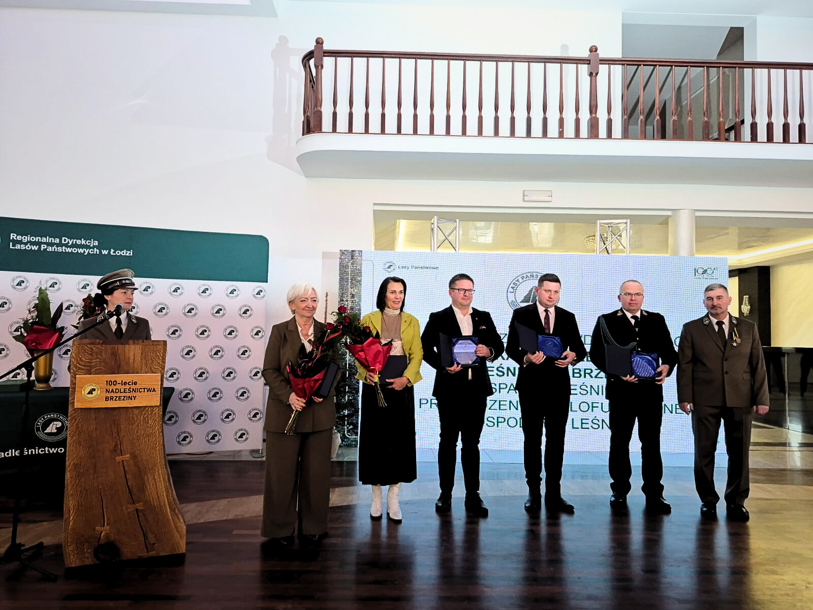 W dowód uznania i wdzięczności z okazji 100-lecia Nadleśnictwa Brzeziny, za wsparcie leśników w prowadzeniu wielofunkcyjnej gospodarki leśnej pamiątkową statuetkę otrzymała wojewoda łódzki Dorota Ryl.