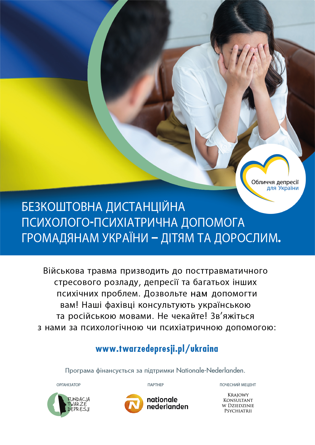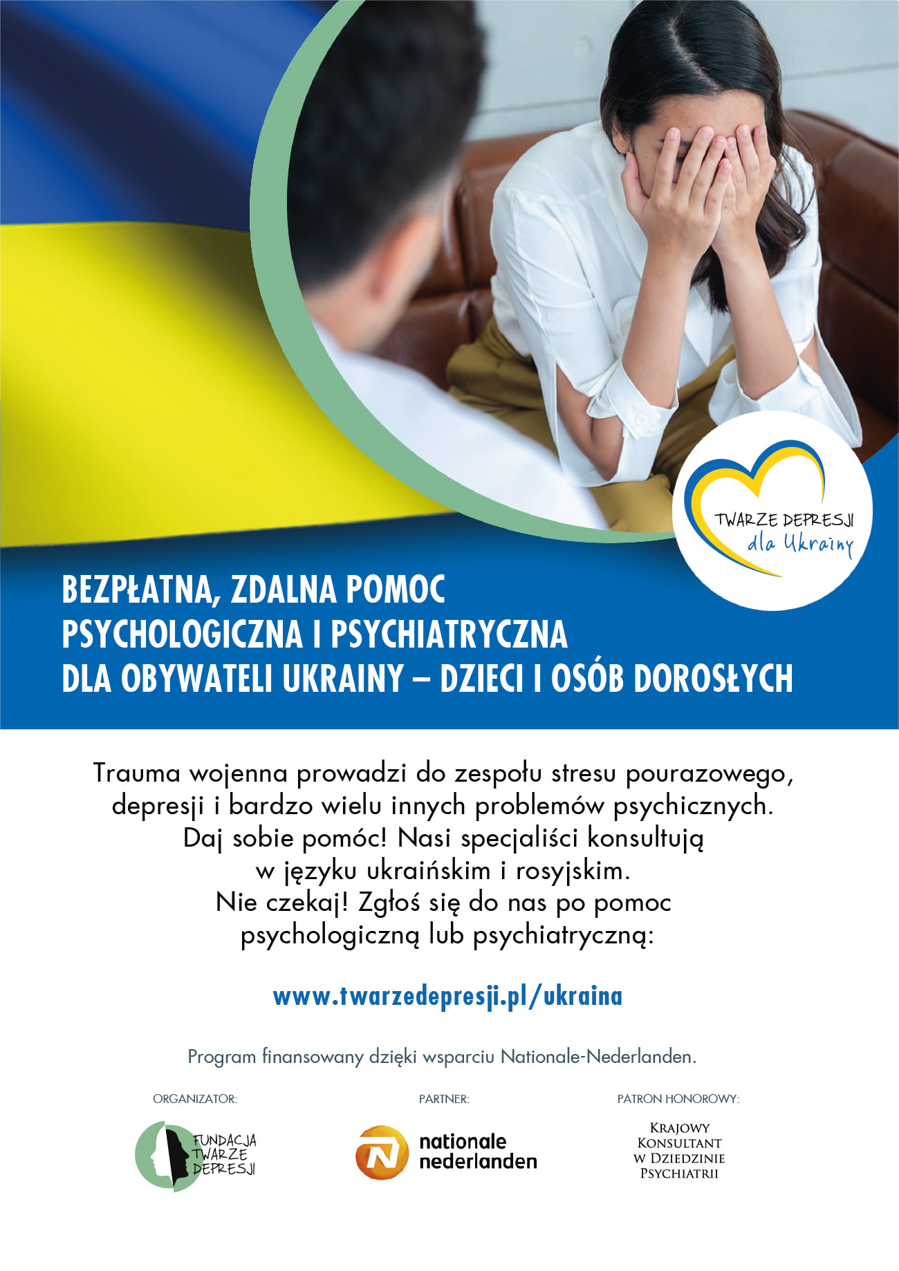 W obliczu ostatnich wydarzeń nie zostają obojętni obojętni wobec obywateli Ukrainy. Zapisy do programu pomocy odbywają się na stronie internetowej: https://twarzedepresji.pl/ukraina Pomoc udzielana będzie w sposób zdalnych spotkań.