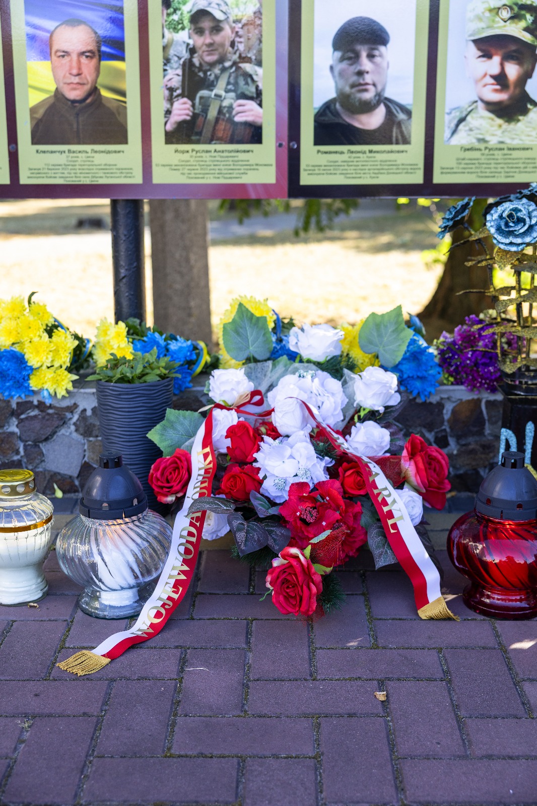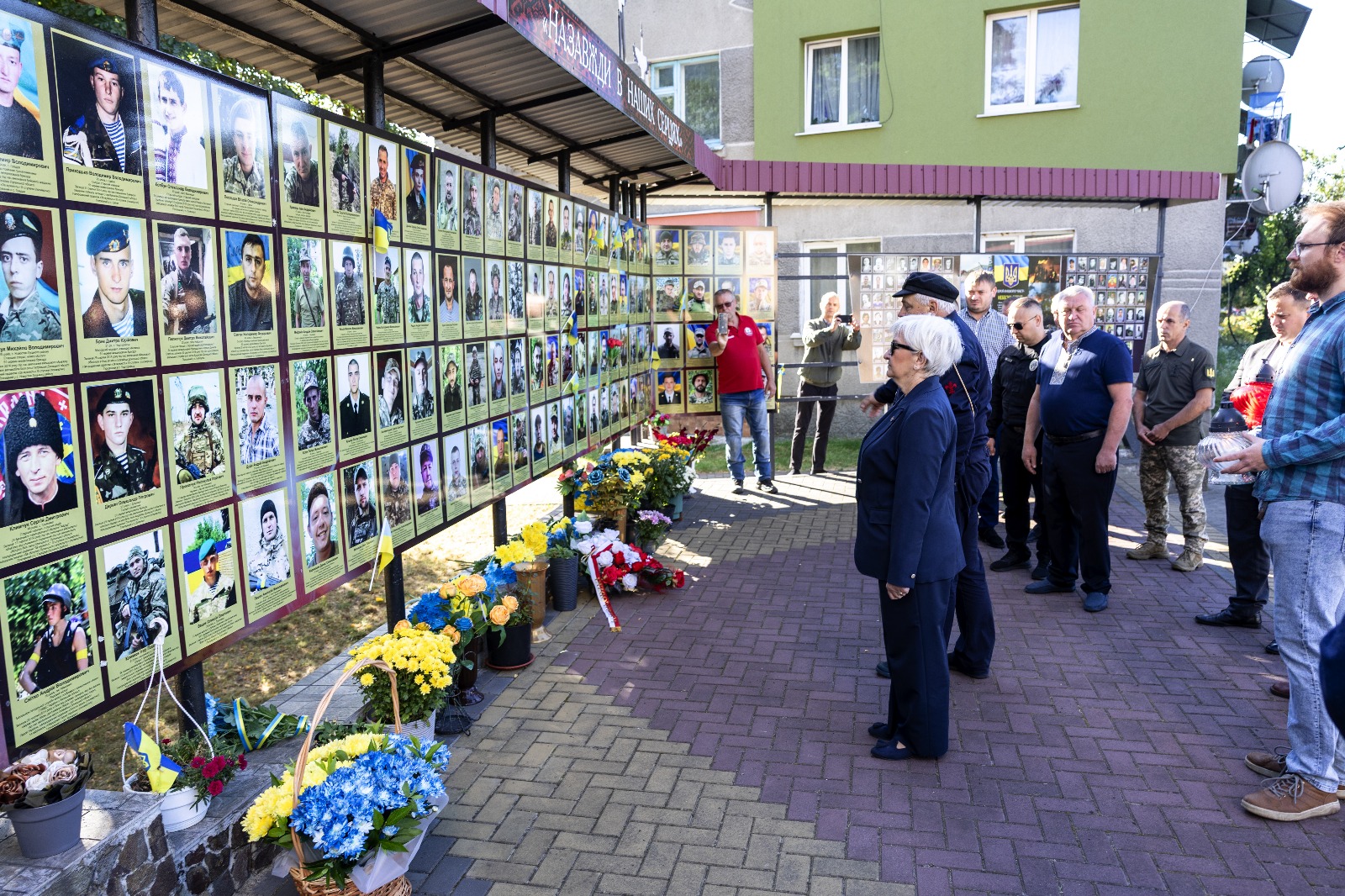 Podczas uroczystości oddała hołd, składając kwiaty pod tablicą upamiętniającą ofiary i poległych w trwającej wojnie z Rosją.