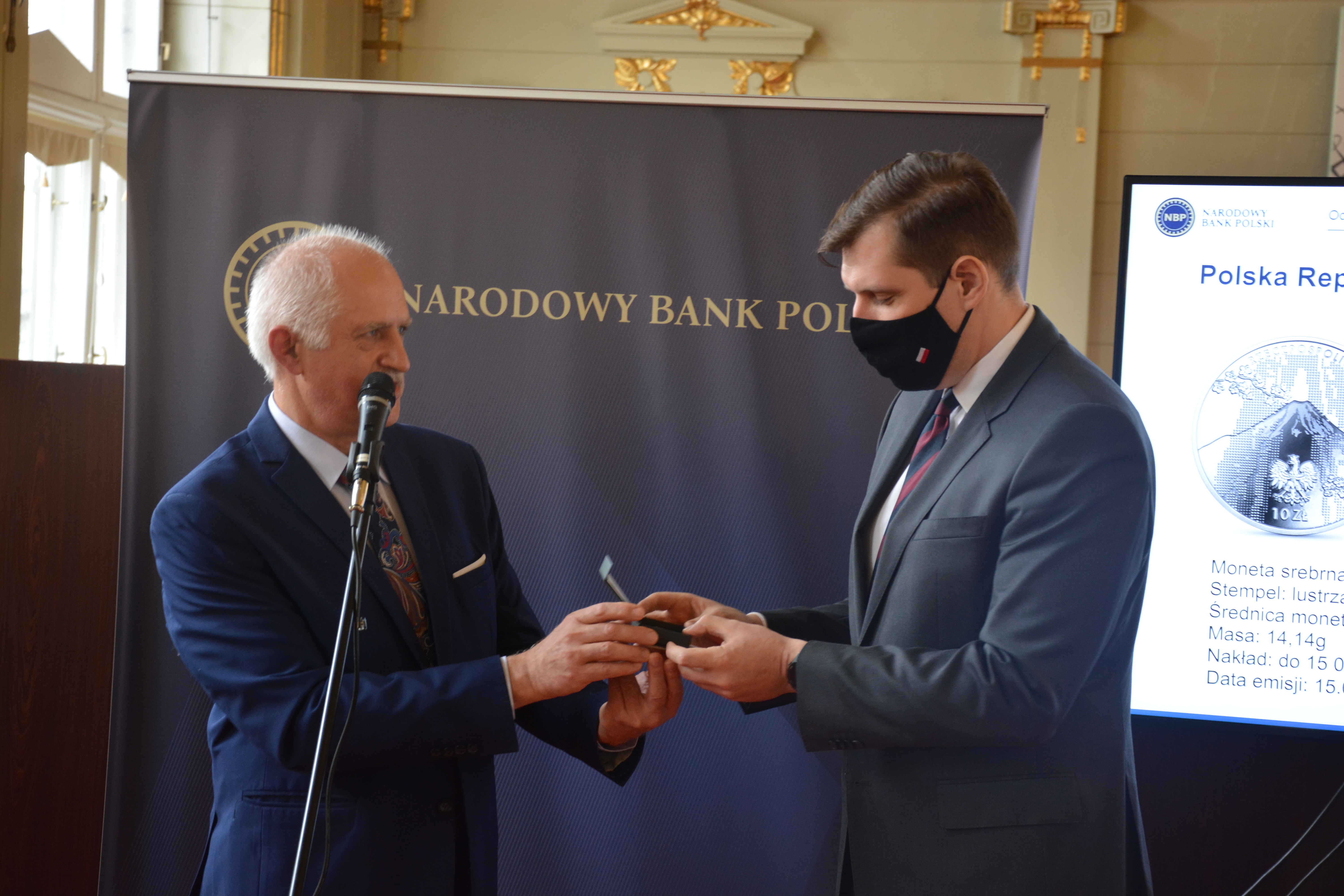 W trakcie trwania uroczystości zaprezentowano także okolicznościowe monety, które Narodowy Bank Polski z tej okazji wybił. Jedna z nich została symbolicznie wręczona wojewodzie łódzkiemu Tobiaszowi Bocheńskiemu.