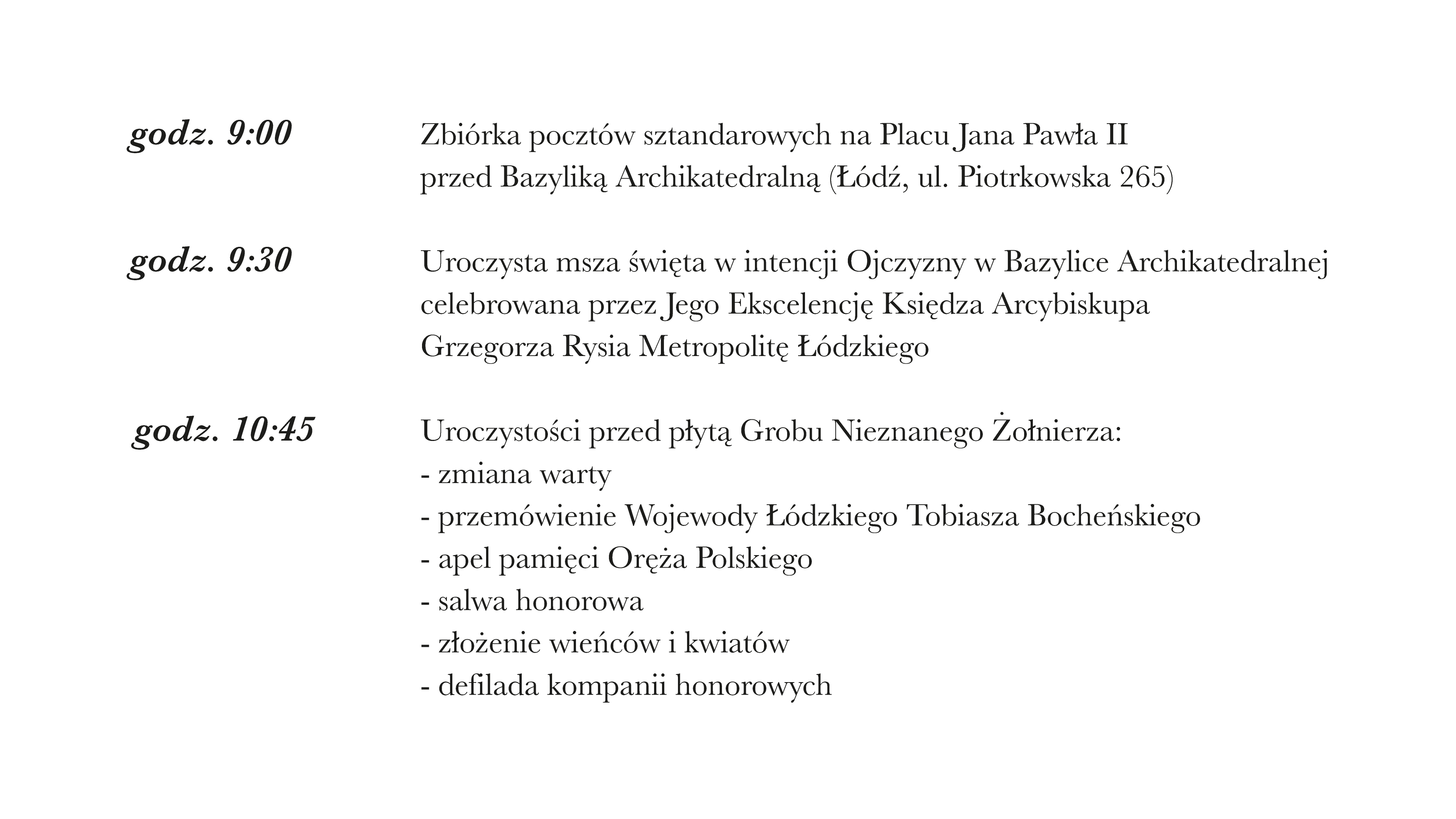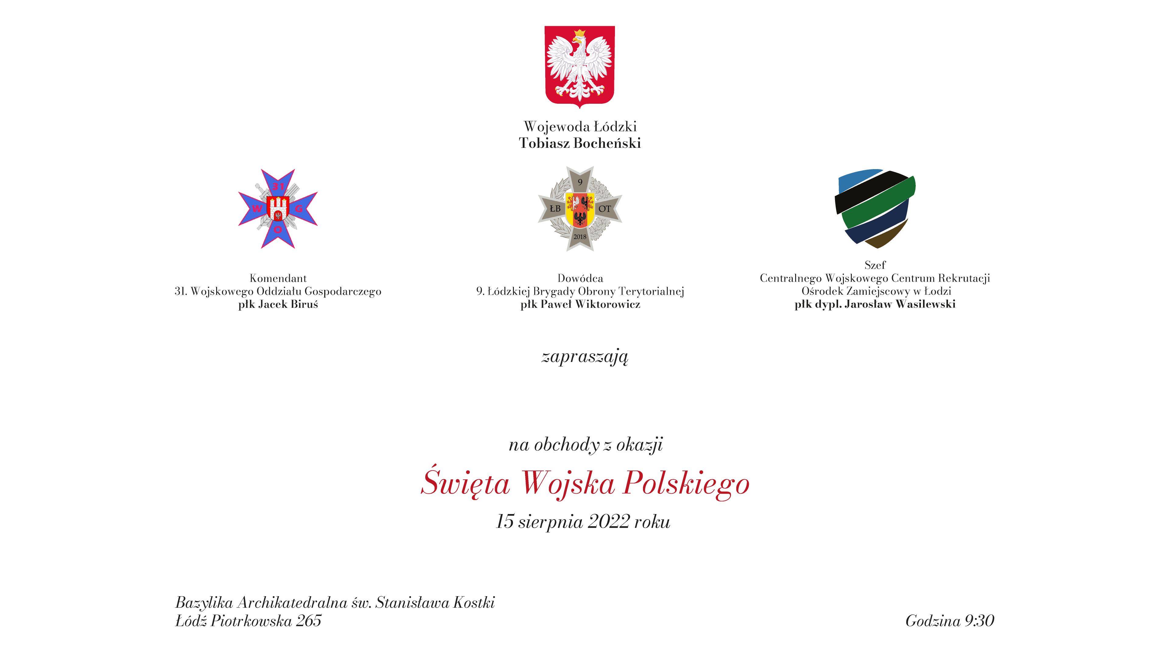 Wojewoda Łódzki Tobiasz Bocheński zaprasza na Wojewódzkie Obchody Święta Wojska Polskiego. Uroczystości rozpoczną się o godz. 09:30 mszą świętą w intencji Ojczyzny w Bazylice Archikatedralnej w Łodzi. Od godziny 10:45 na Placu Jana Pawła II przed płytą Grobu Nieznanego Żołnierza w ramach obchodów zaplanowano: