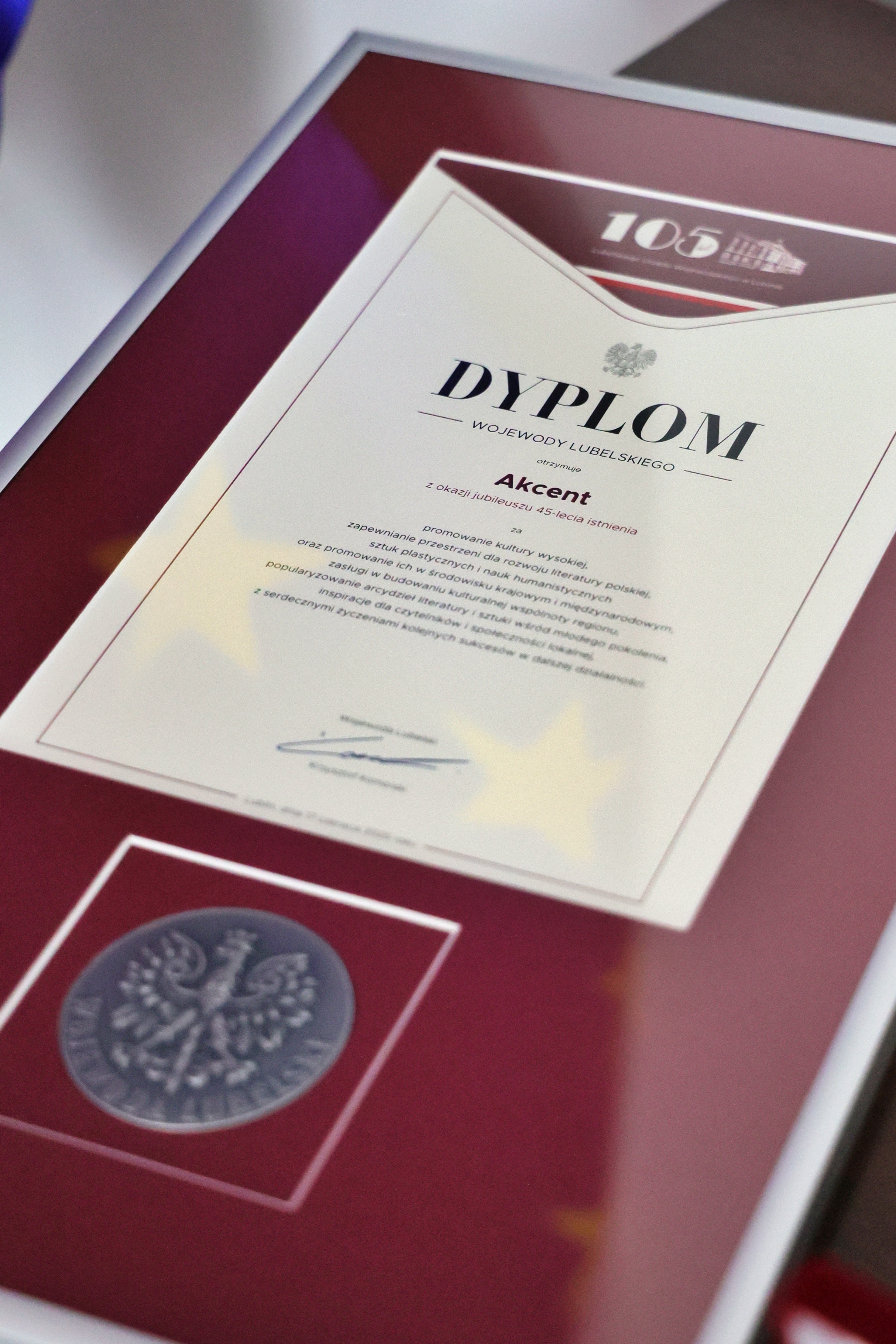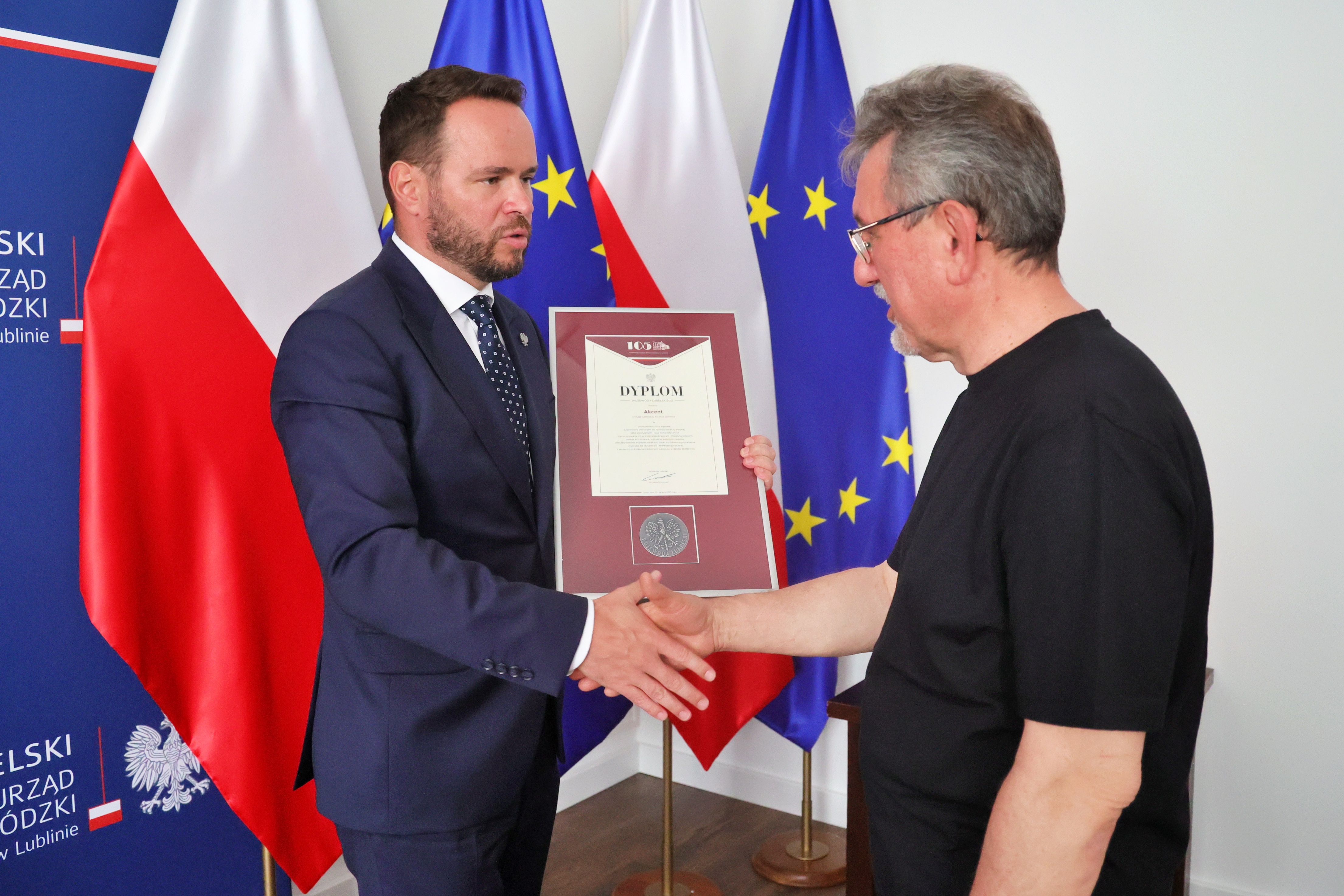 Czasopismo „Akcent” ukazuje się w Lublinie od 45 lat. Z okazji jubileuszu wojewoda Krzysztof Komorski wręczył we wtorek redaktorowi naczelnemu Bogusławowi Wróblewskiemu Dyplom Wojewody Lubelskiego.
