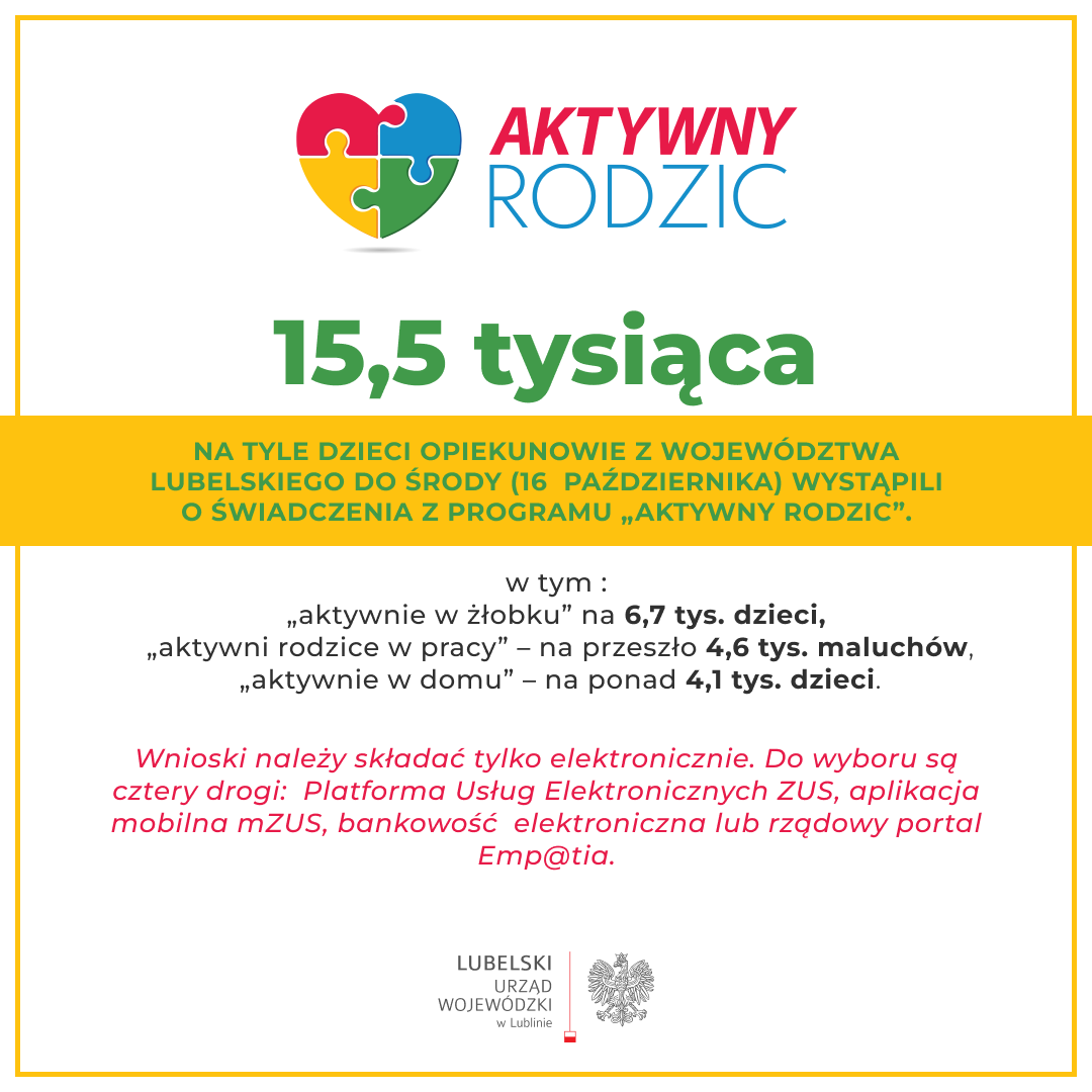 15,5 tysiąca – na tyle dzieci opiekunowie z województwa lubelskiego do środy (16 października) wystąpili o świadczenia z programu „Aktywny rodzic”. Zakład Ubezpieczeń Społecznych od października przyjmuje wnioski o trzy nowe rodzaje świadczeń.