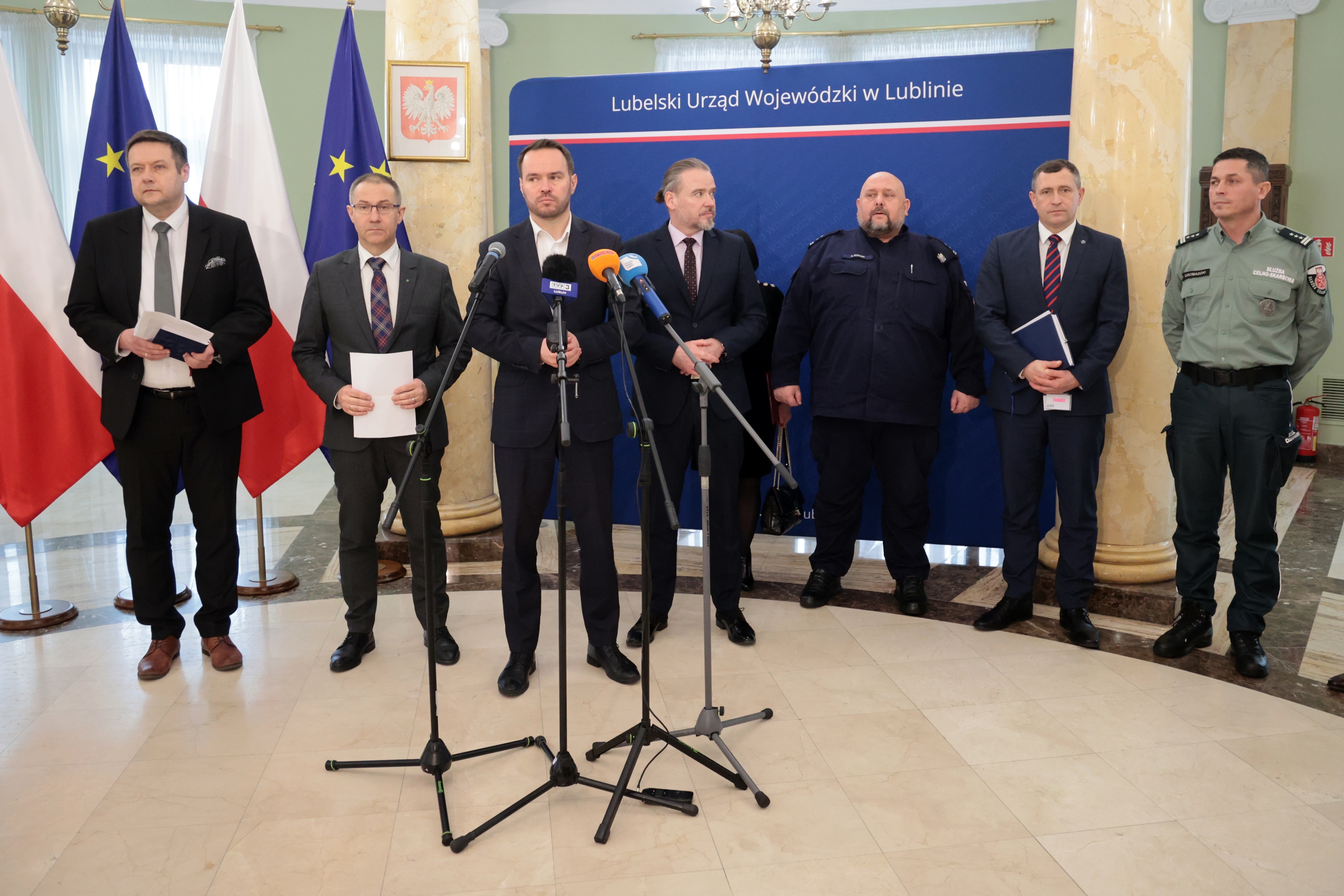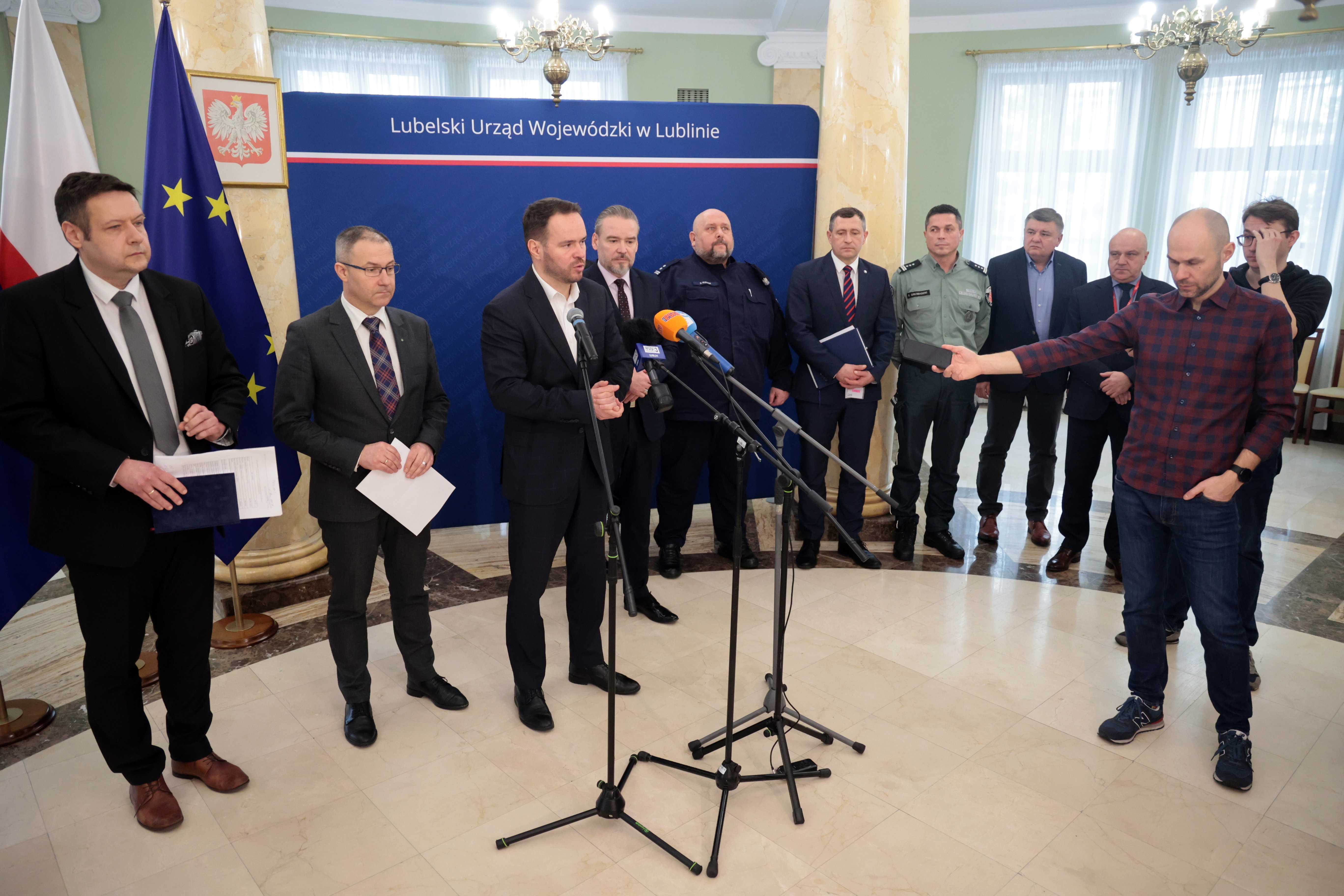 W spotkaniu z dziennikarzami uczestniczyli także wicewojewodowie Wojciech Wołoch oraz Andrzej Maj. O swoich działaniach poinformowali przedstawiciele służb mundurowych, administracji skarbowej, weterynaryjnej i sanitarno-epidemiologicznej oraz dyrektorzy Wydziału Środowiska i Rolnictwa oraz Wydziału Bezpieczeństwa i Zarządzania Kryzysowego Lubelskiego Urzędu Wojewódzkiego w Lublinie.
