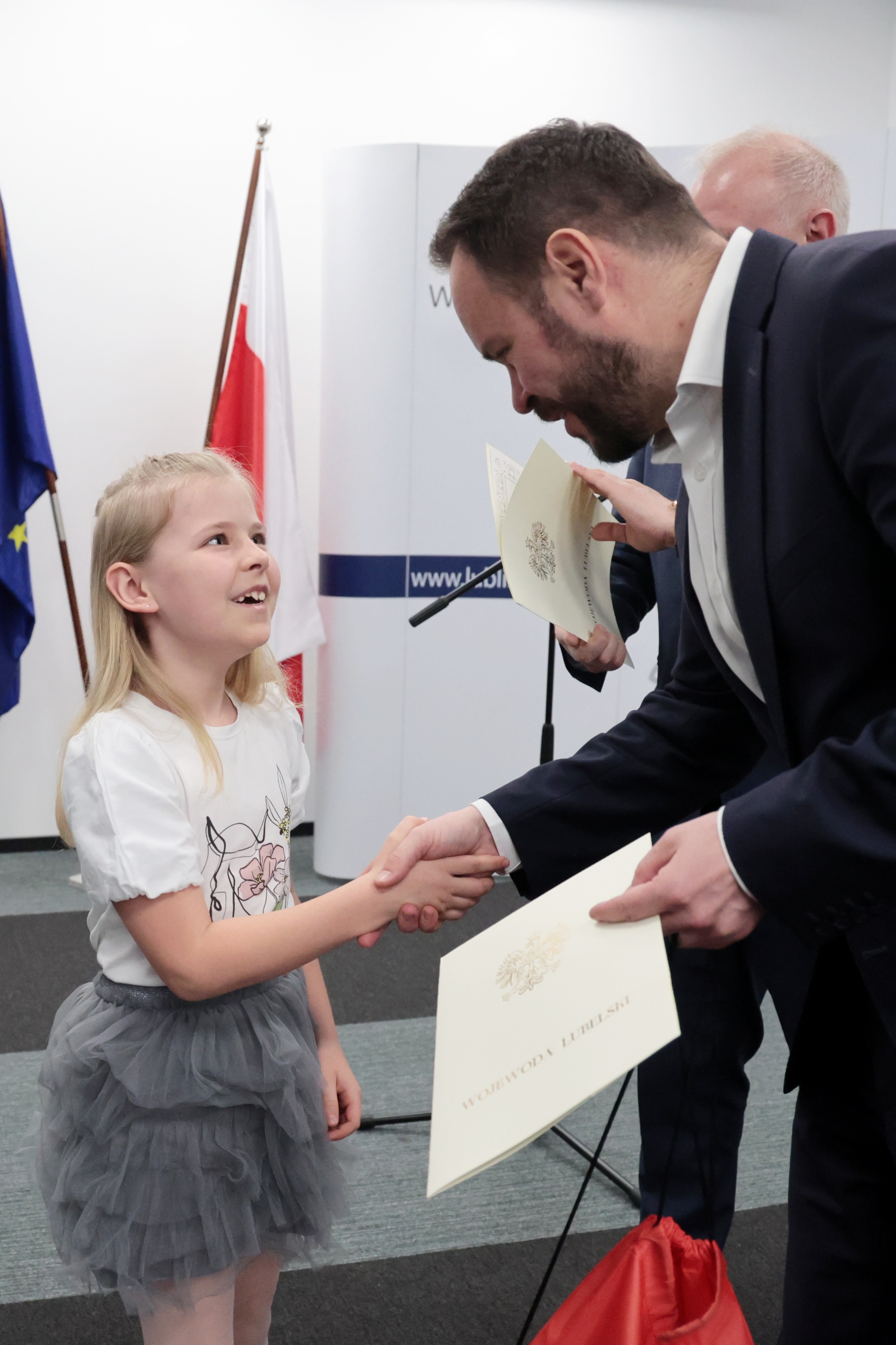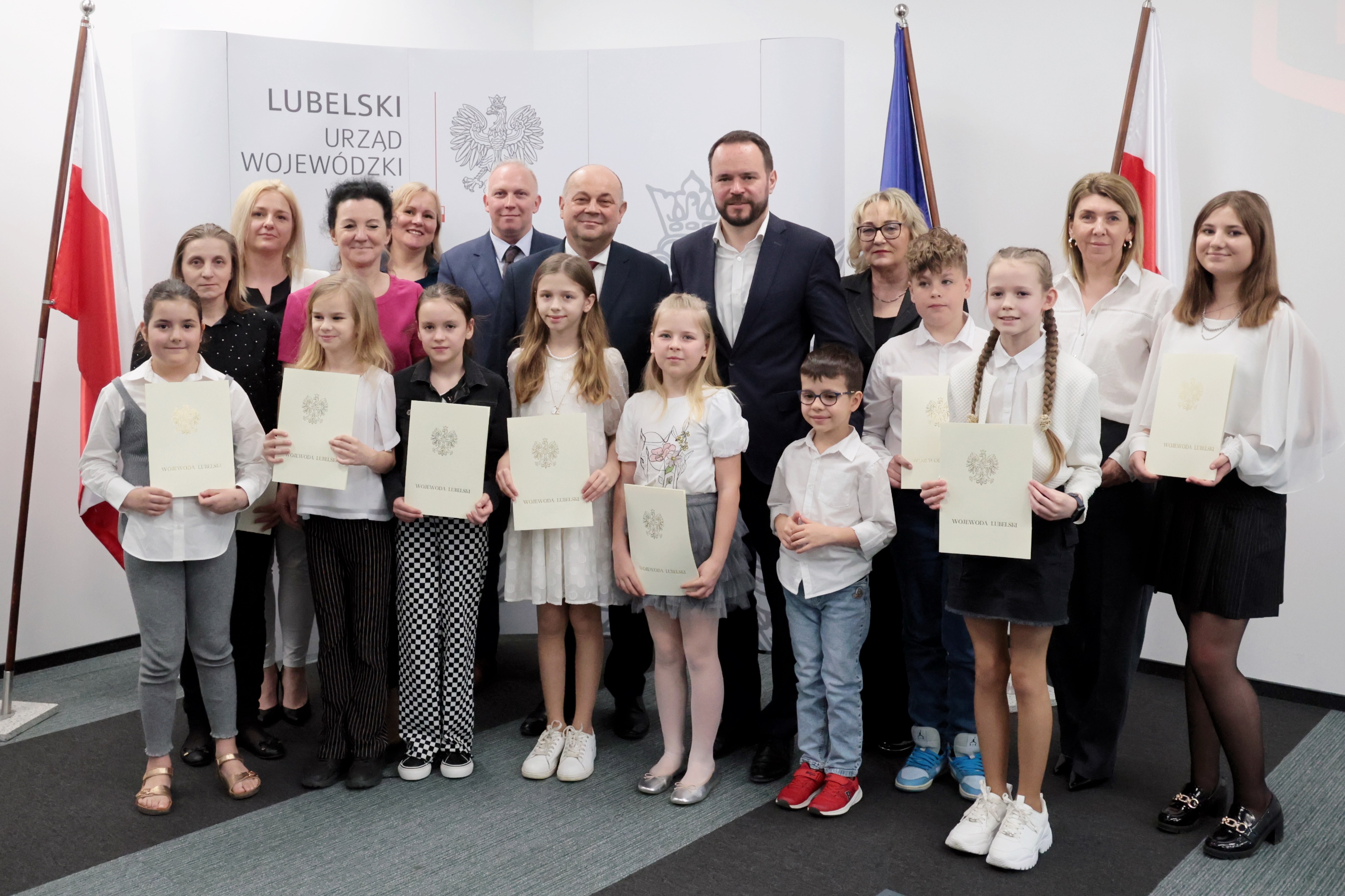 Poznaliśmy laureatów konkursu „Raz, dwa, trzy – pomagasz ty; jeden, jeden, dwa – pomagam ja”. Wręczenie nagród odbyło się we wtorek w Centrum Powiadamiania Ratunkowego w Lublinie, a udział w wydarzeniu wzięli wojewoda lubelski Krzysztof Komorski, dyrektor generalny Lubelskiego Urzędu Wojewódzkiego Jarosław Szymczyk oraz Lubelski Kurator Oświaty Tomasz Szabłowski.