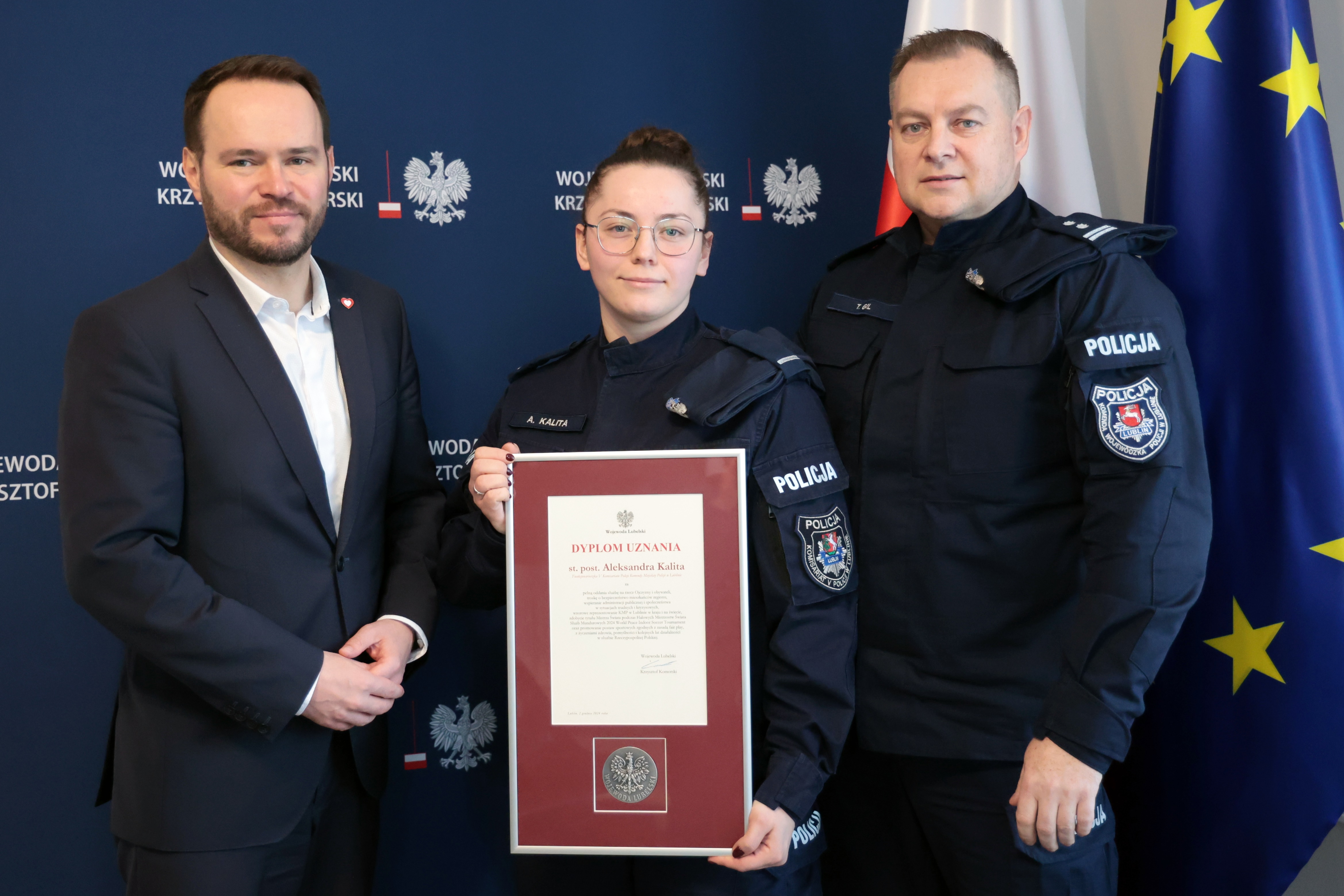 Podczas spotkania, w którym uczestniczył także Komendant Wojewódzki Policji w Lublinie, mł. insp. Tomasz Gil, wojewoda lubelski wręczył Aleksandrze Kalicie dyplom uznania za pełną oddania służbę, troskę o bezpieczeństwo mieszkańców regionu, ale i wzorowe reprezentowanie KMP w Lublinie w kraju i na świecie.