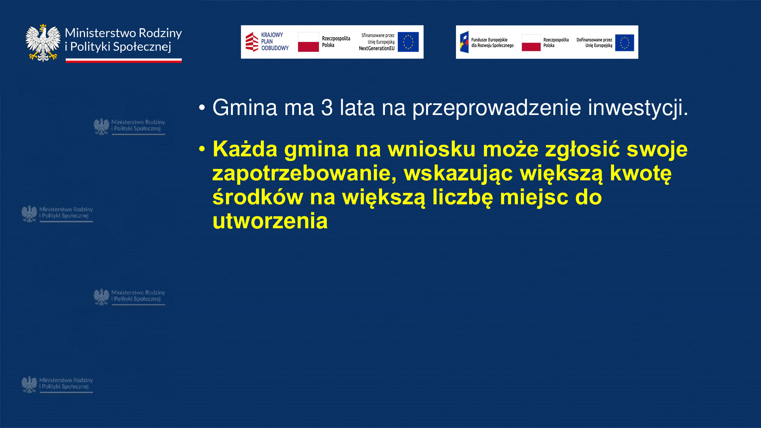 Złożenie przez gminę wniosku o wysokość środków przyznanych zgodnie z algorytmem stanowi potwierdzenie chęci skorzystania z wyznaczonej wysokości dofinansowania. Ważne! Każda gmina na wniosku może również zgłosić swoje zapotrzebowanie, wskazując większą kwotę środków na większą liczbę miejsc do utworzenia.