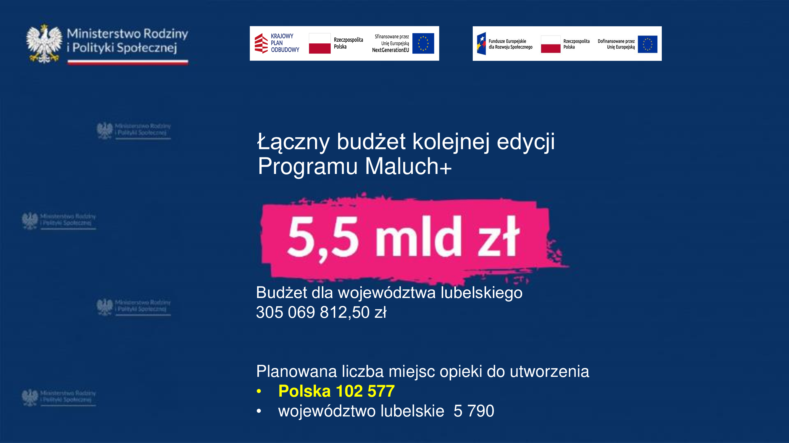 Pod nową odsłoną programu Maluch+ kryje się jeden wieloletni program, jednolity systemem finansowania oraz takie same zasady obejmujące całą Polskę. Na Program przeznaczono kwotę prawie 5,5 mld zł, dzięki czemu może powstać w kraju ponad 100 tys. nowych miejsc opieki. Dla województwa lubelskiego zaplanowano ponad 305 mln zł, które wspomogą powstanie ponad 5,7 tys. miejsc w województwie lubelskim. Jest to szczególnie istotne, ponieważ w 149 gminach w Lubelskiem brakuje miejsc opieki nad maluchami.
