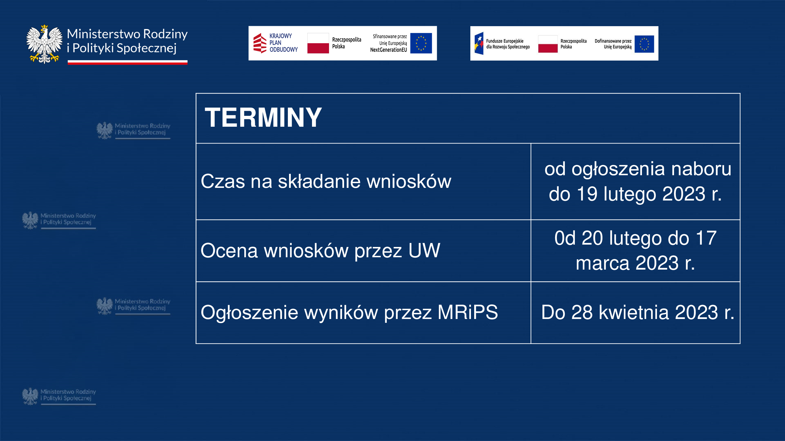 Czas na składanie wniosków – do 19 lutego 2023 r. Następnie, do 17 marca Urzędy Wojewódzkie będą miały czas na ocenę wniosków. Ogłoszenie wyników przez Ministra Rodziny i Polityki Społecznej odbędzie się do 28 kwietnia 2023 r.