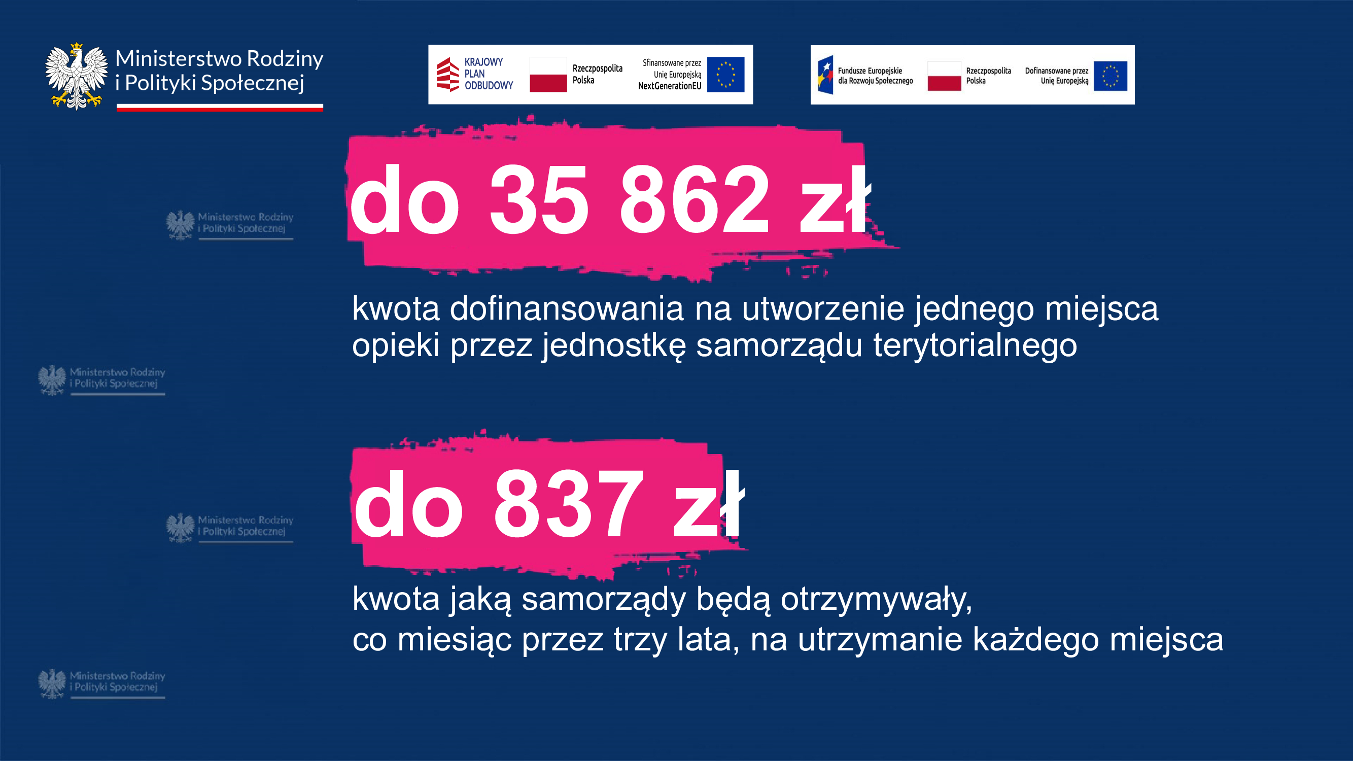 Kwota dofinansowania na funkcjonowanie przez 12 i 24 miesiące 1 miejsca utworzonego z KPO i FERS to ok. 837 zł miesięcznie.