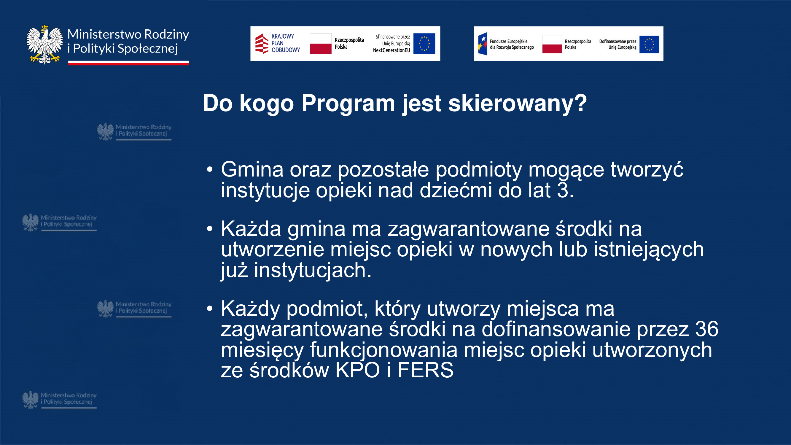 Środki w ramach Programu MALUCH+ 2022-2029 przeznaczone są w pierwszej kolejności dla gmin. Każda gmina ma zagwarantowane środki na utworzenie miejsc opieki w nowych lub istniejących już instytucjach oraz środki na dofinansowanie przez 36 miesięcy funkcjonowania utworzonych miejsc opieki.