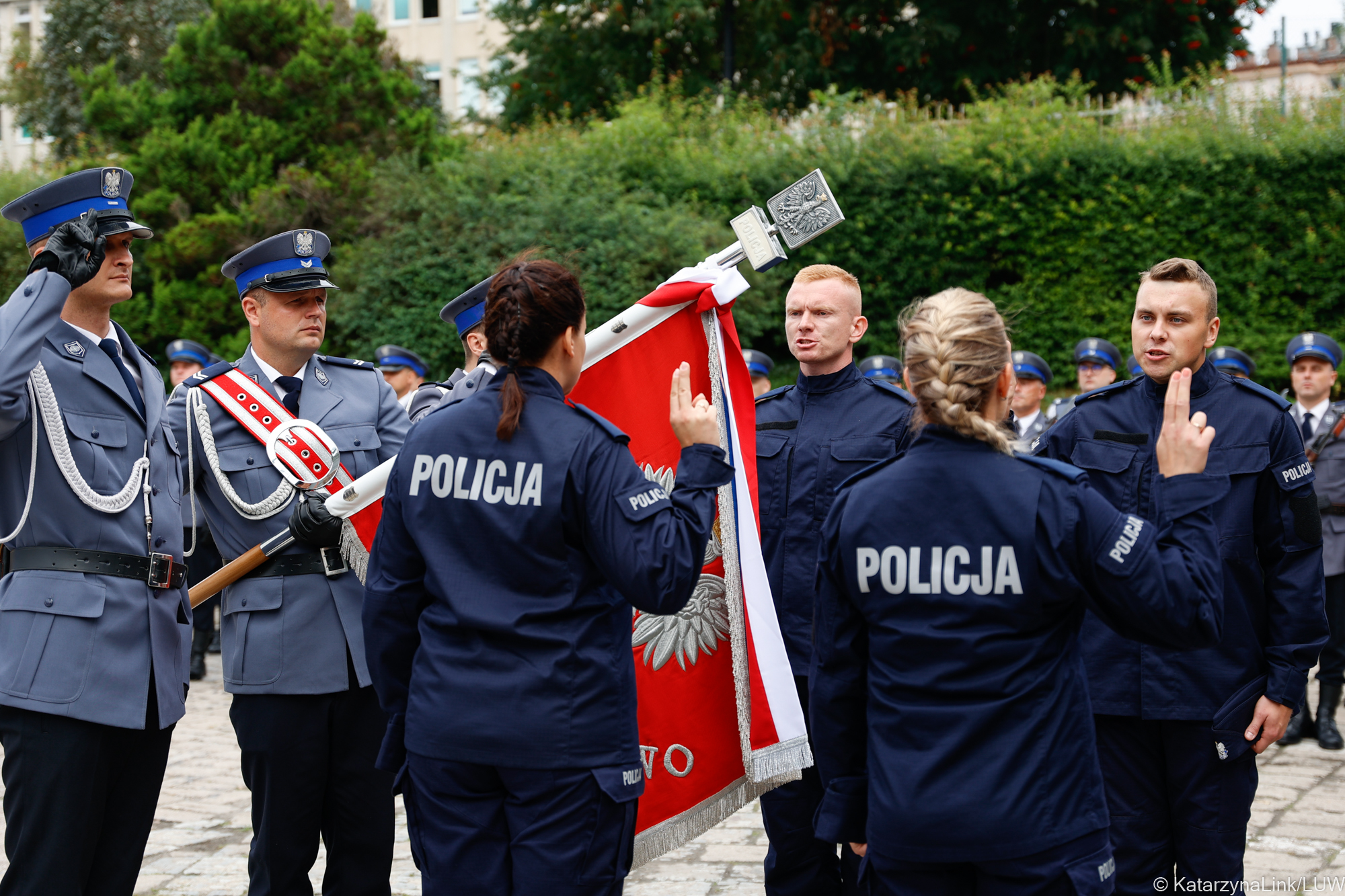 Ja, obywatel Rzeczypospolitej Polskiej, świadom podejmowanych obowiązków policjanta, ślubuję: służyć wiernie Narodowi, chronić ustanowiony Konstytucją Rzeczypospolitej Polskiej porządek prawny, strzec bezpieczeństwa Państwa i jego obywateli, nawet z narażeniem życia. Wykonując powierzone mi zadania, ślubuję pilnie przestrzegać prawa, dochować wierności konstytucyjnym organom Rzeczypospolitej Polskiej, przestrzegać dyscypliny służbowej oraz wykonywać rozkazy i polecenia przełożonych. Ślubuję strzec tajemnic związanych ze służbą, honoru, godności i dobrego imienia służby oraz przestrzegać zasad etyki zawodowej
