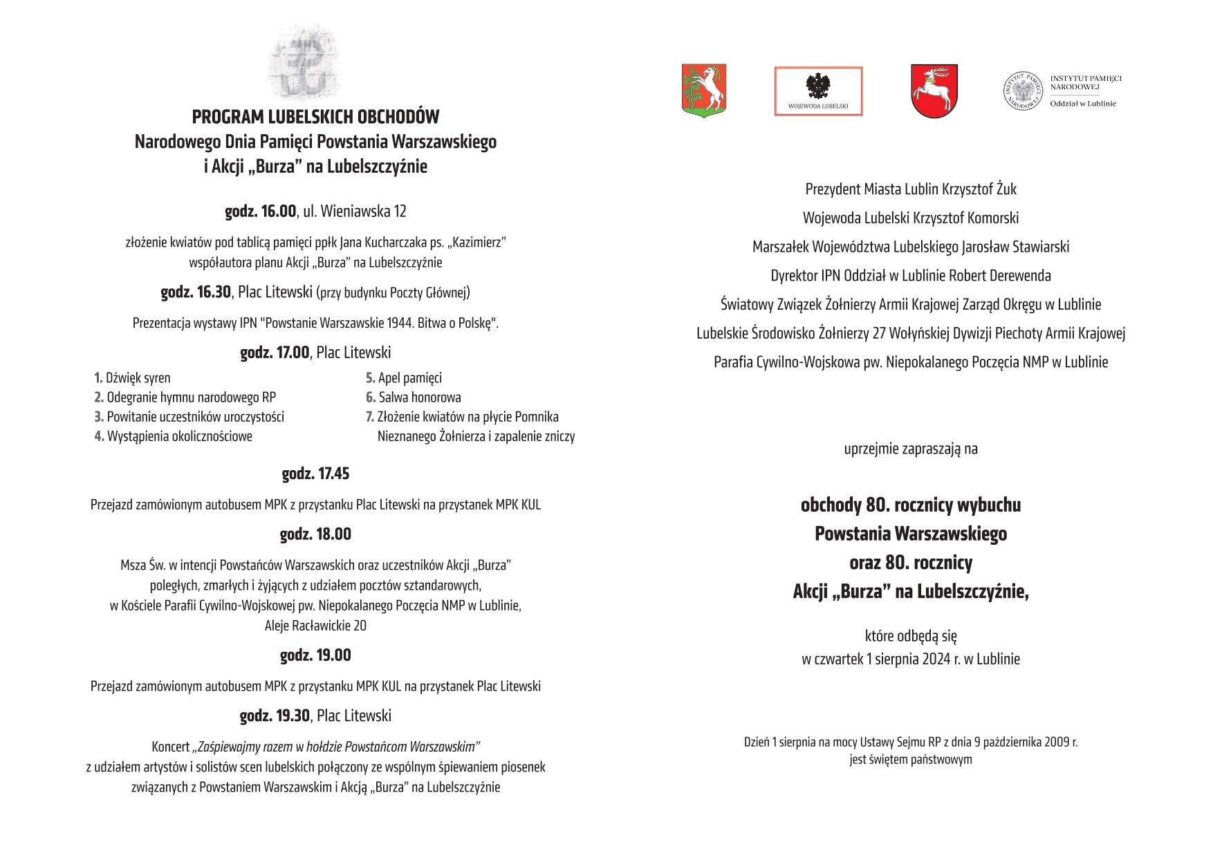 - godz. 16.30 – prezentacja wystawy „Powstanie Warszawskie 1944. Bitwa o Polskę”, przygotowanej przez Instytut Pamięci Narodowej Oddział w Lublinie (Plac Litewski);