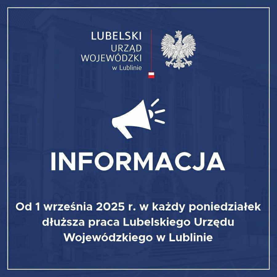Szczegółowe informacje dotyczące godzin pracy poszczególnych oddziałów będzie można sprawdzić od 1 września 2025 r. w zakładce „Załatw sprawę” na stronie internetowej Urzędu lub na stronie BIP Lubelskiego Urzędu Wojewódzkiego w Lublinie.