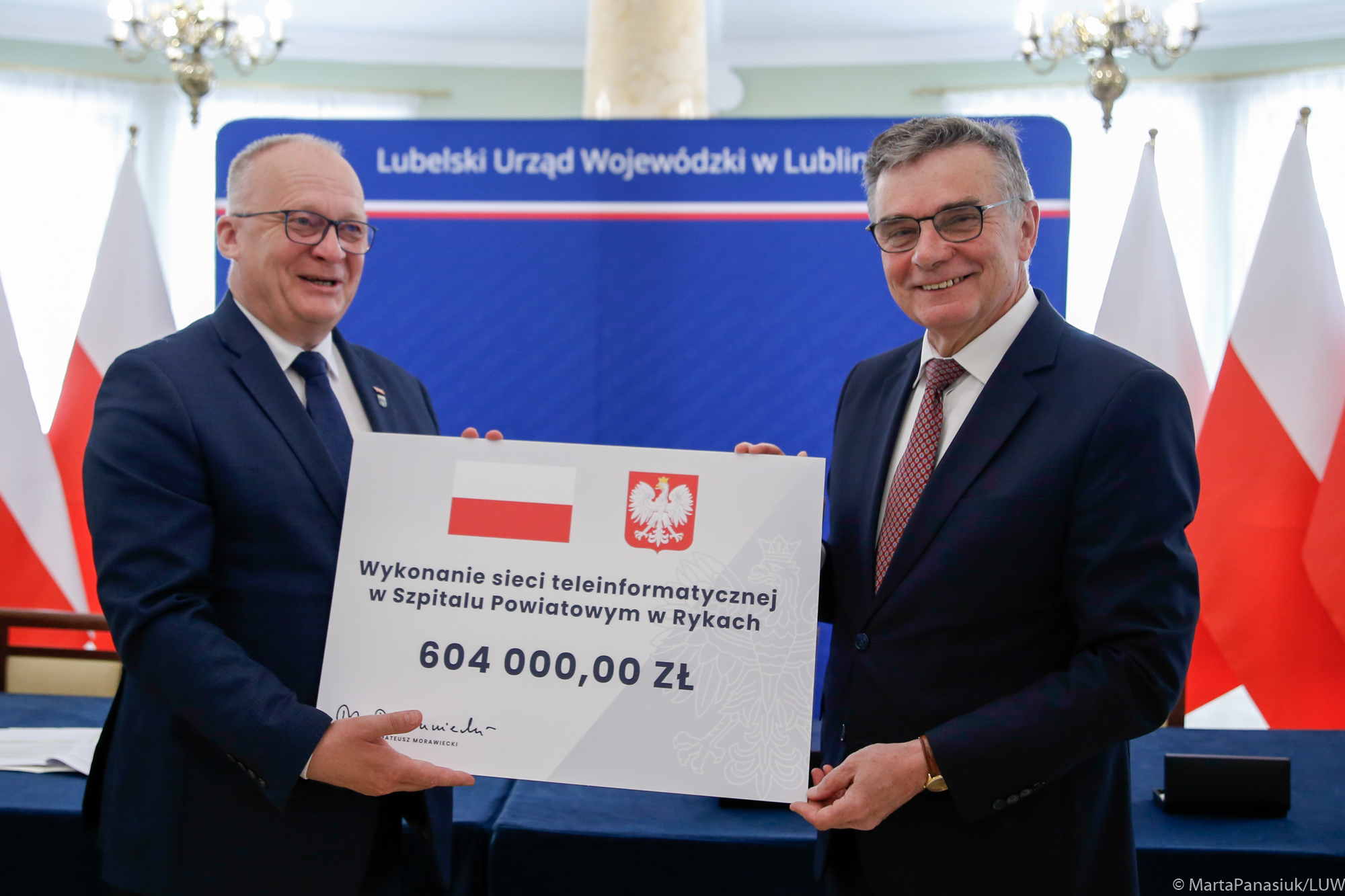 Wojewoda lubelski Lech Sprawka podpisał z Powiatem Ryckim umowę w sprawie udzielenia dotacji celowej z budżetu państwa w roku 2023 na dofinansowanie zadania pn.: „Wykonanie sieci teleinformatycznej w Szpitalu Powiatowym w Rykach”. Wysokość dotacji to 604 tys. zł. Zgodnie z umową wykonanie zadania ma nastąpić do 31 grudnia 2023 r.