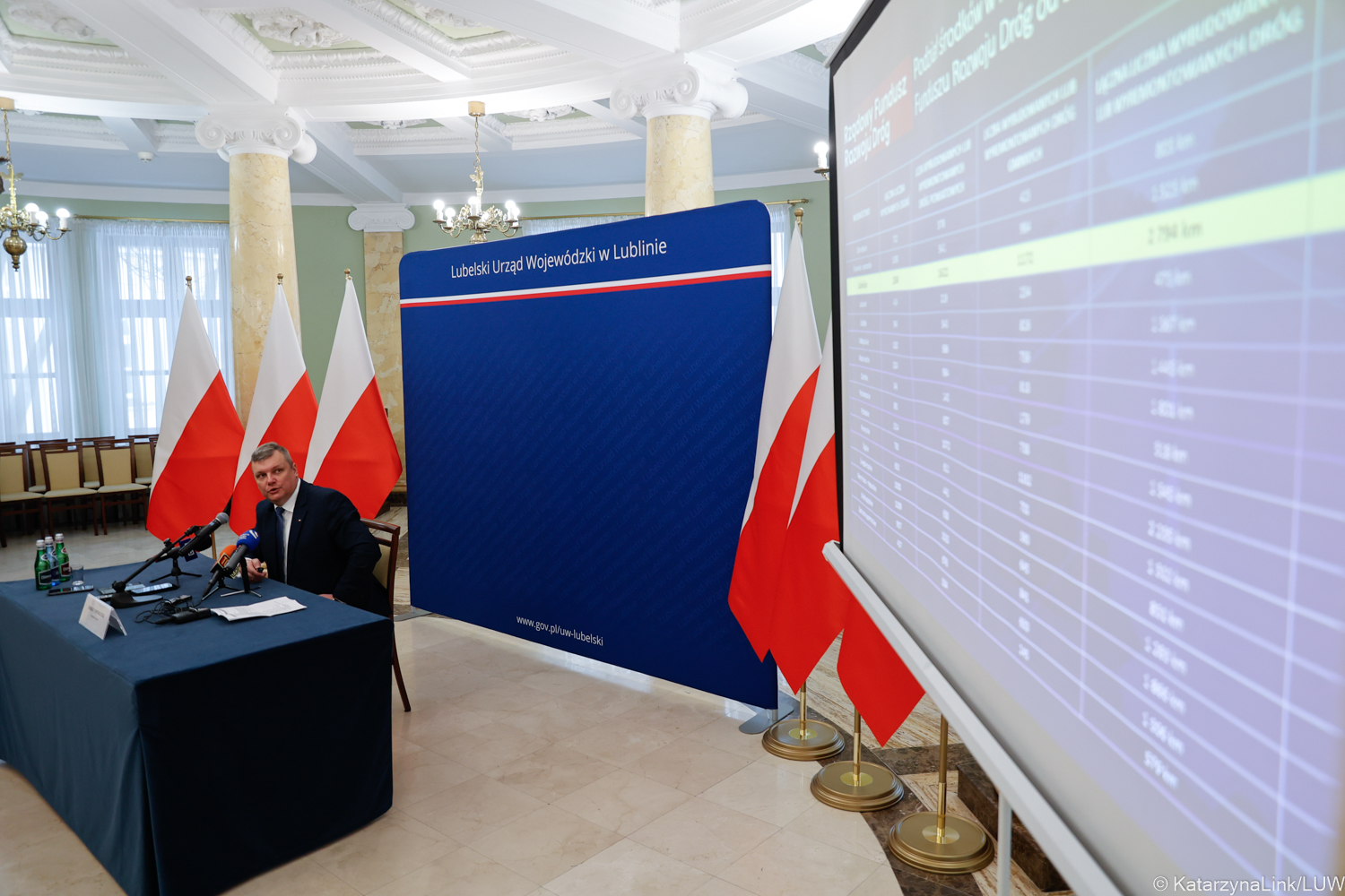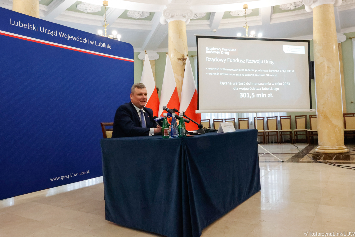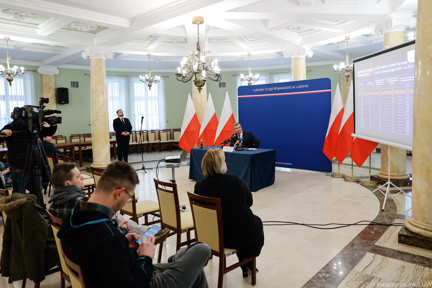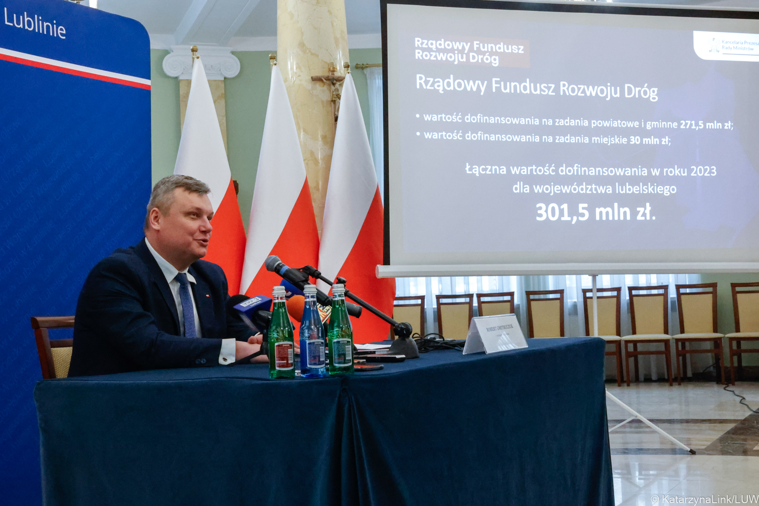 W Lubelskim Urzędzie Wojewódzkim odbyła się konferencja prasowa wicewojewody lubelskiego Roberta Gmitruczuka, dotycząca wyników Rządowego Funduszu Rozwoju Dróg 2023 dla województwa lubelskiego.