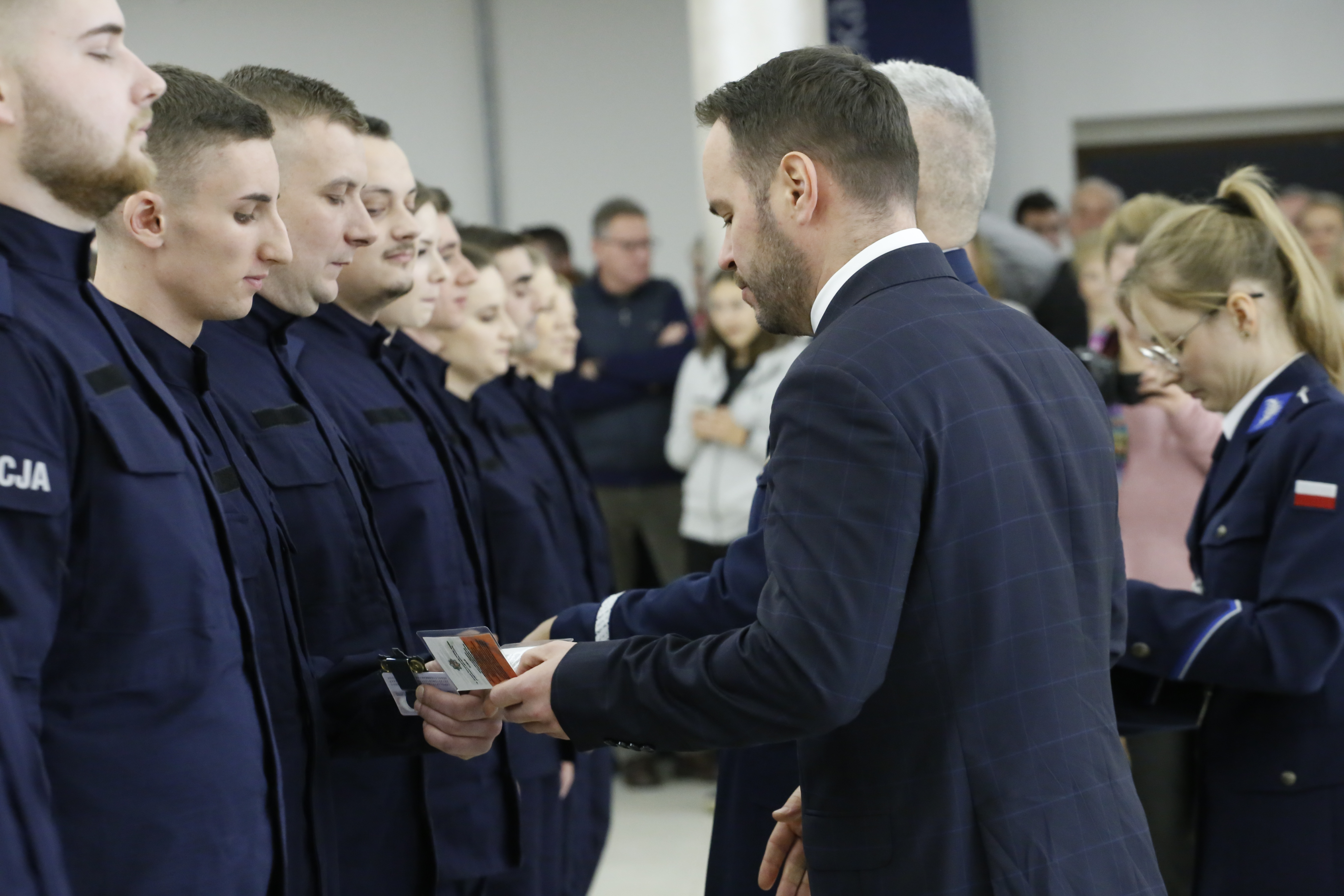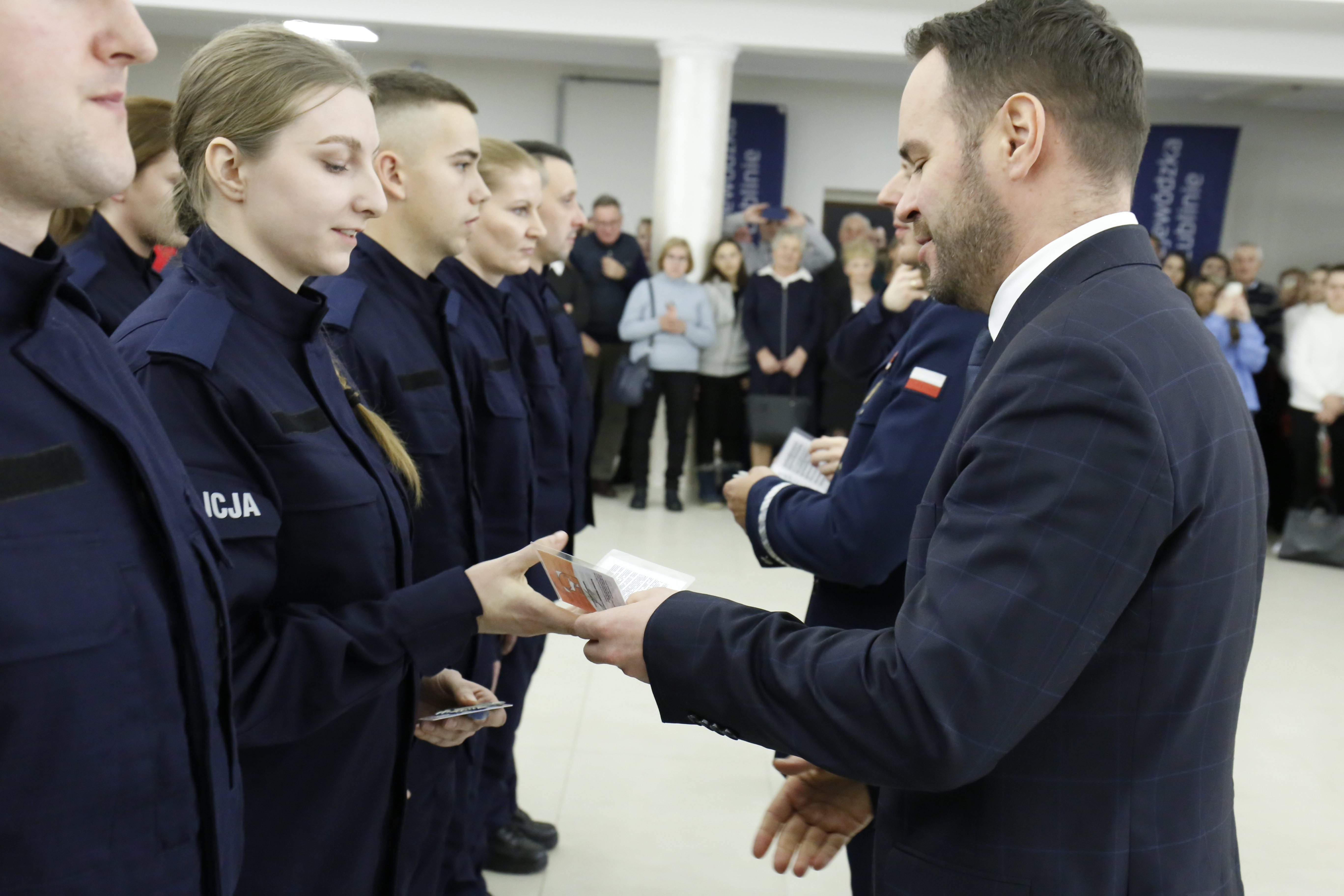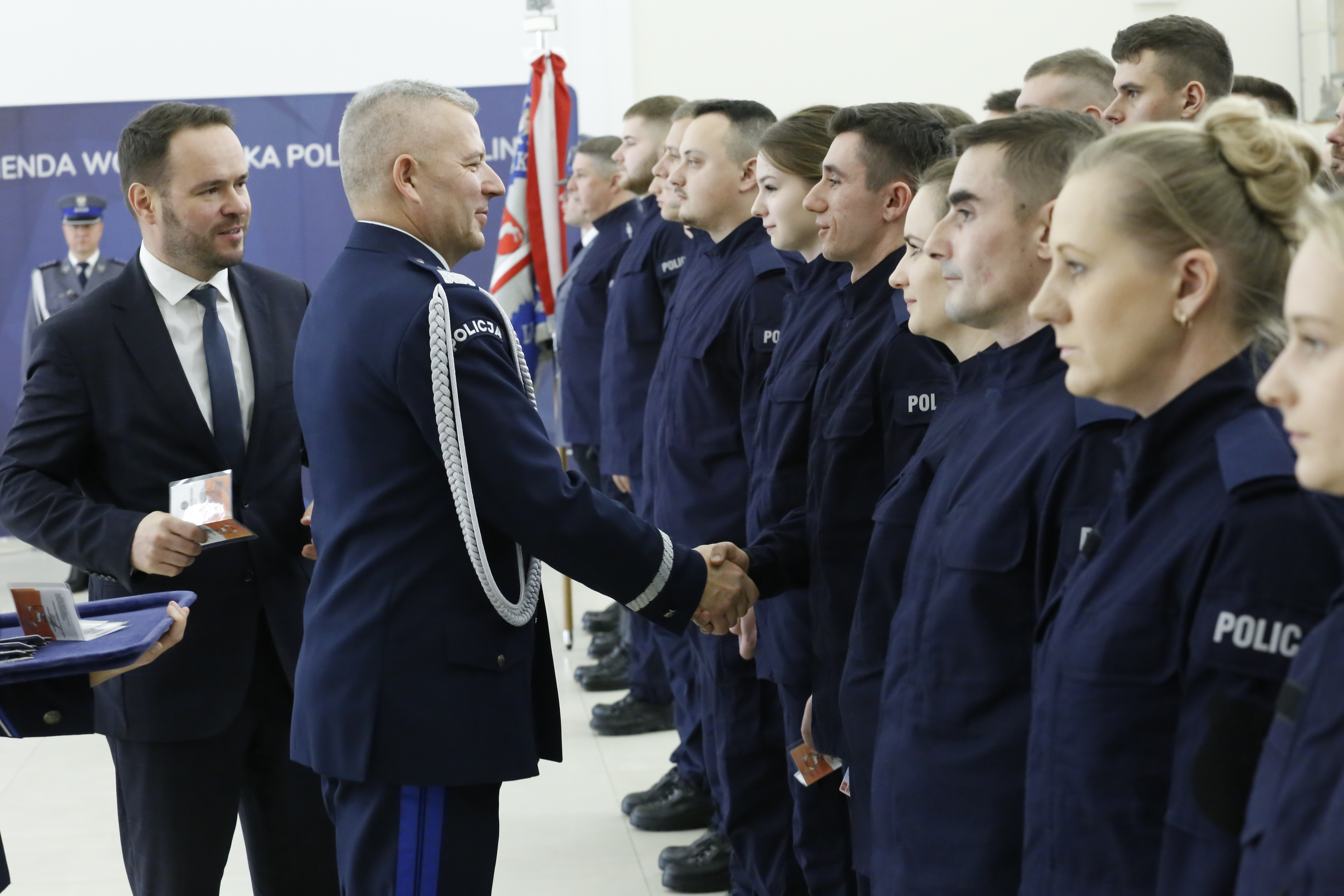 Nowo przyjęci policjanci Garnizonu Lubelskiego złożyli ślubowanie podczas uroczystej zbiórki, zorganizowanej w siedzibie Komendy Wojewódzkiej Policji w Lublinie. Funkcjonariusze wstępujący w szeregi formacji odebrali legitymacje służbowe i „Zasady etyki zawodowej policjanta”, które wręczył wojewoda lubelski Krzysztof Komorski. Uroczystość odbyła się zgodnie z ceremoniałem policyjnym.