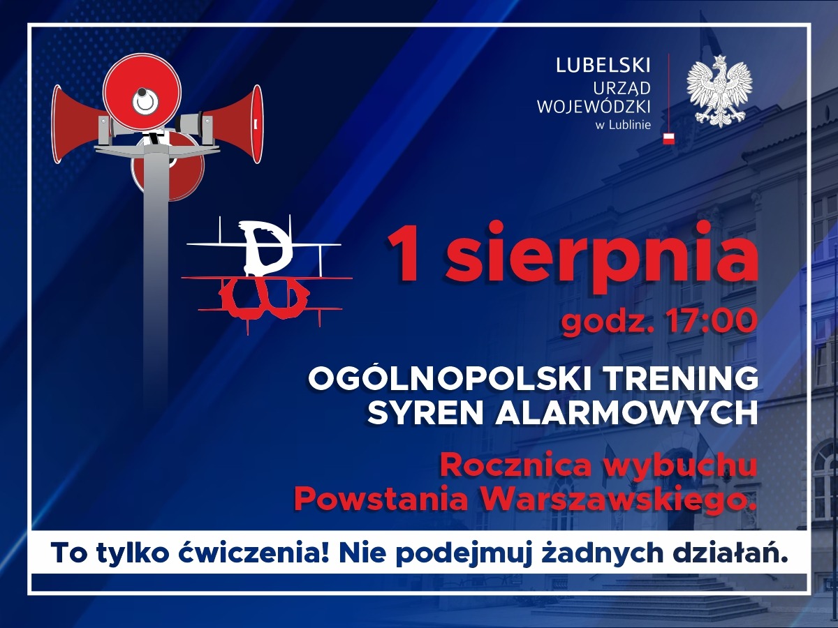 W piątek 1 sierpnia o godzinie 17:00 na terenie całego kraju zostaną uruchomione syreny alarmowe w ramach ogólnokrajowego treningu systemu powiadamiania, ostrzegania i alarmowania ludności.