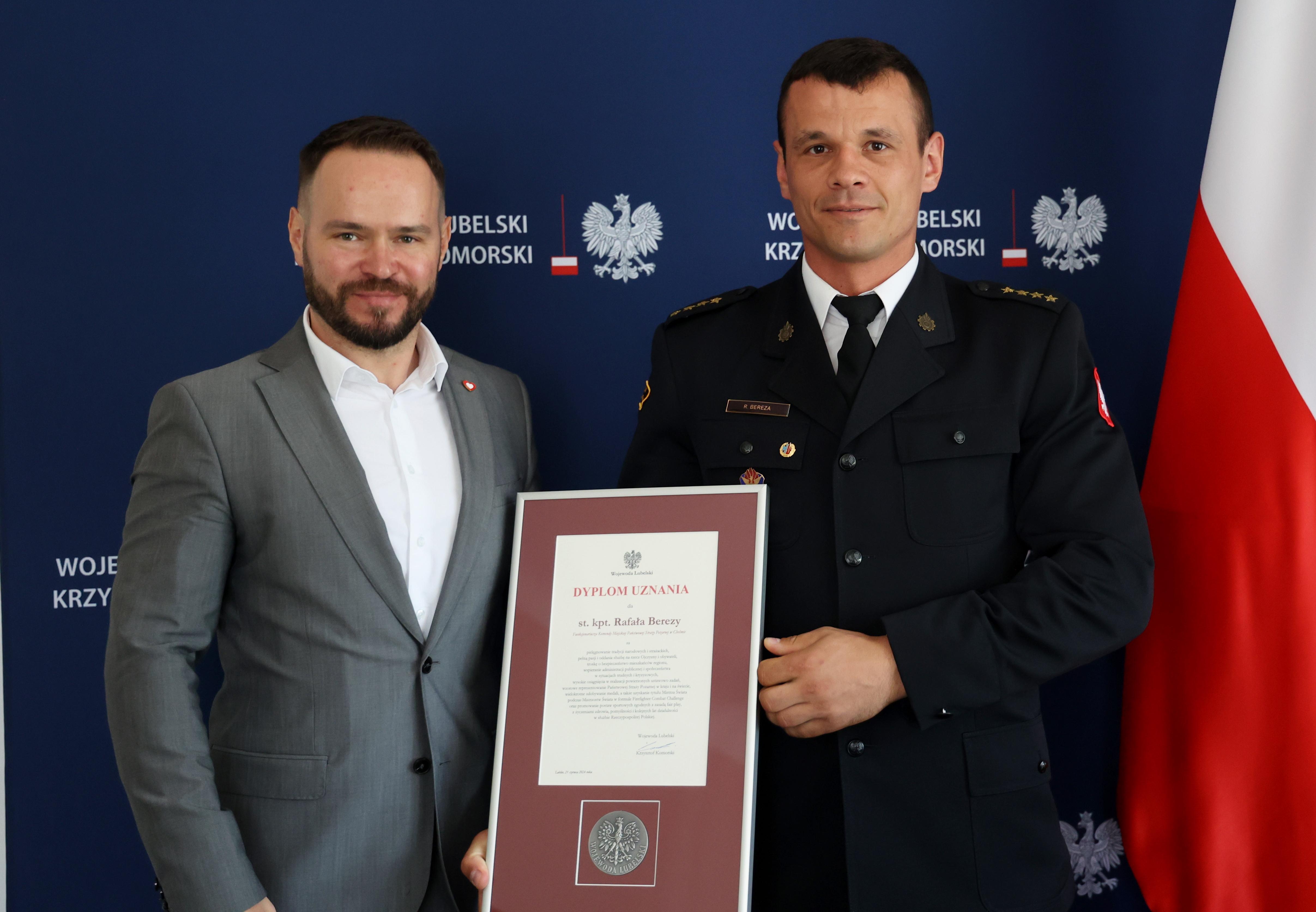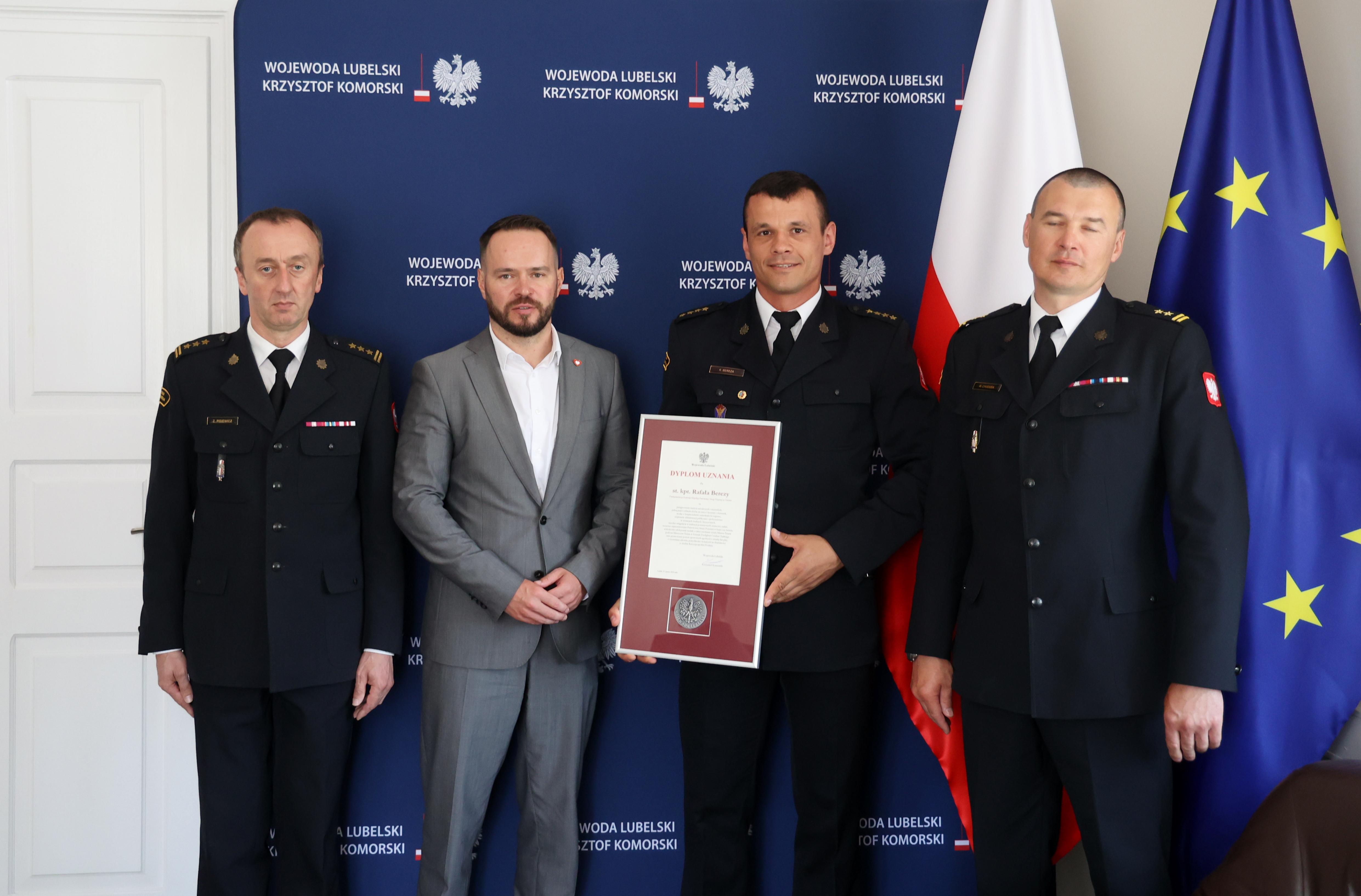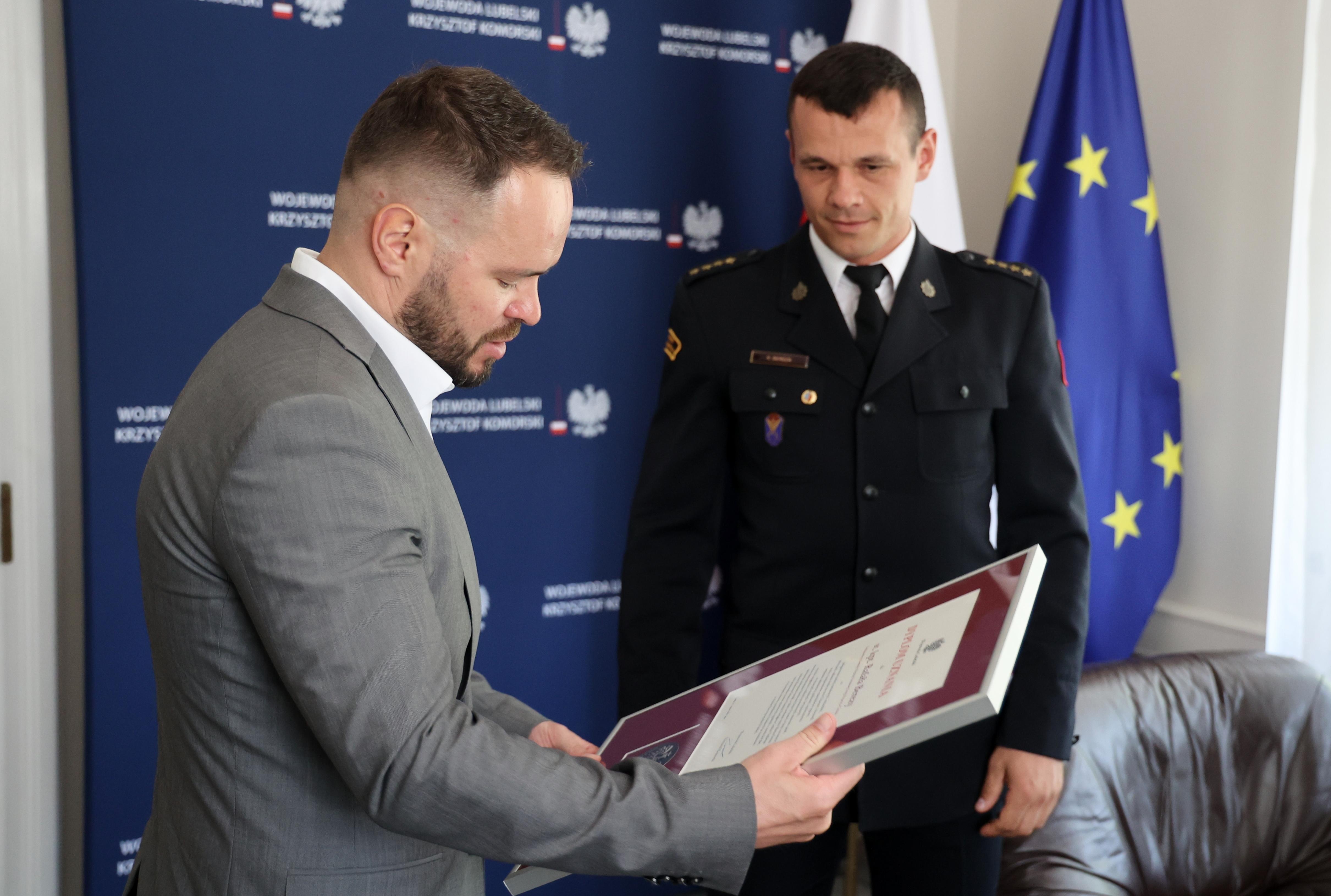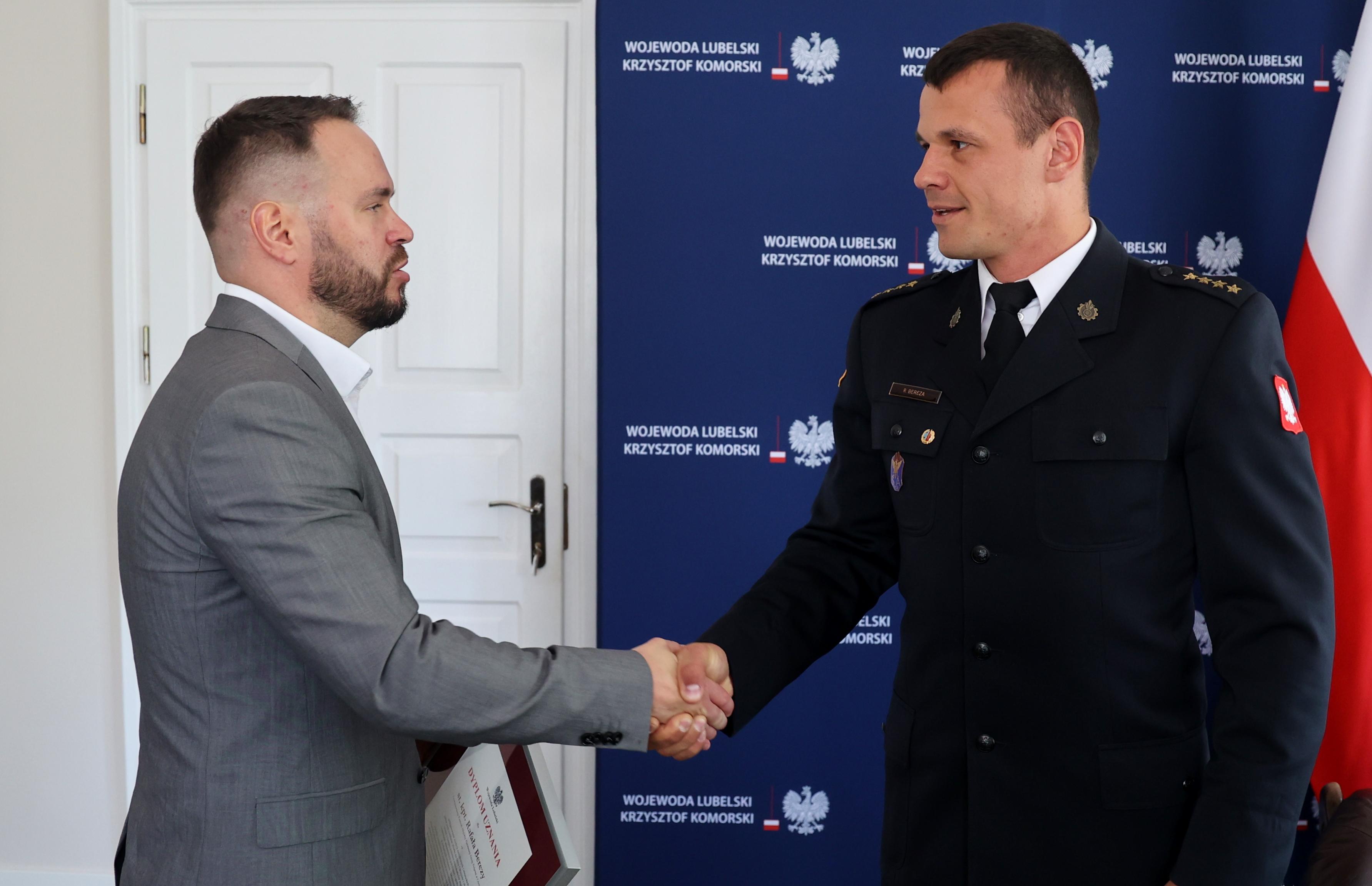 Wojewoda lubelski Krzysztof Komorski gościł w piątek st. kpt. Rafała Berezę. Wręczył mu Dyplom Wojewody Lubelskiego z Medalem.
