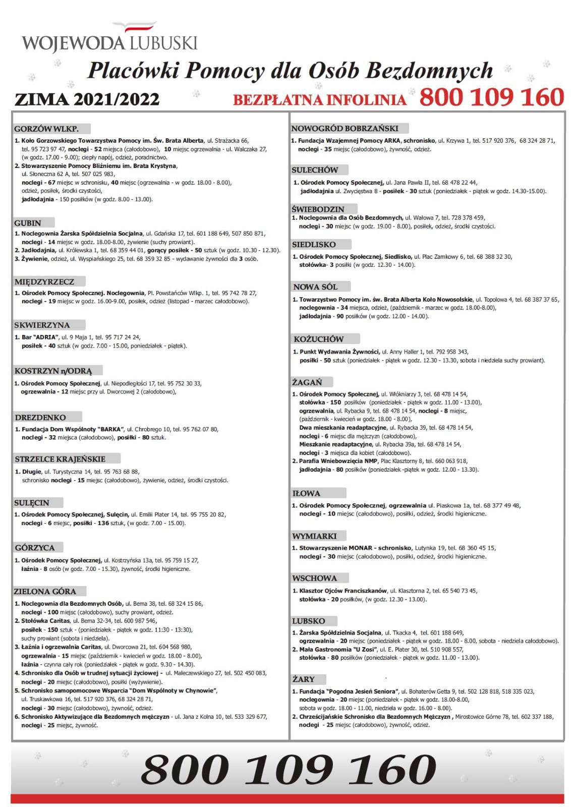 Jak co roku w przestrzeni publicznej oraz na stronach internetowych urzędów pojawią się plakaty informacyjne z wypisem placówek świadczących pomoc osobom bezdomnym w całym województwie lubuskim. Plakat można pobrać z załączników umieszczonych pod tekstem.