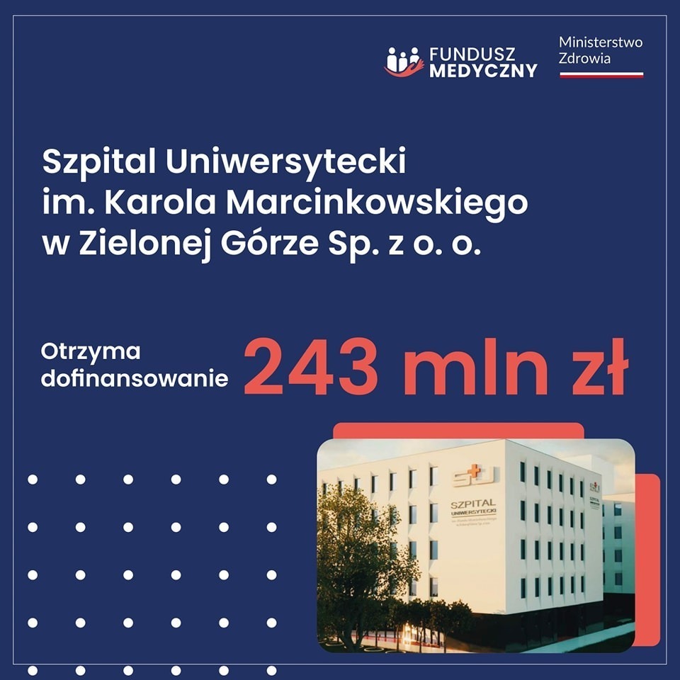 Niemal 243 mln zł trafi do Szpitala Uniwersyteckiego w Zielonej Górze na „Budowę Lubuskiego Uniwersyteckiego Centrum Onkologii w Szpitalu Uniwersyteckim w Zielonej Górze wraz z doposażeniem Zakładu Patomorfologii i Zakładu Radioterapii”! Środki zostaną przyznane na podstawie rozstrzygniętego 13 października br. konkursu onkologicznego w ramach Funduszu Medycznego. 19 podmiotów z 14 województw otrzyma blisko 4,2 mld dofinansowania na inwestycje w infrastrukturę.