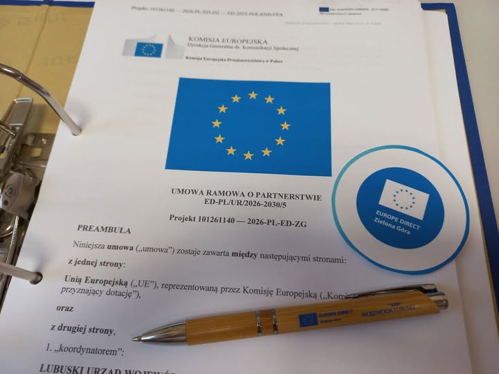 Informujemy o rozpoczęciu realizacji czwartej edycji projektu EUROPE DIRECT ZIELONA GÓRA na lata 2026-2030. Decyzją Komisji Europejskiej w Polsce to właśnie Lubuski Urząd Wojewódzki po raz kolejny został wybrany do prowadzenia lokalnego punktu sieci EUROPE DIRECT w województwie lubuskim.