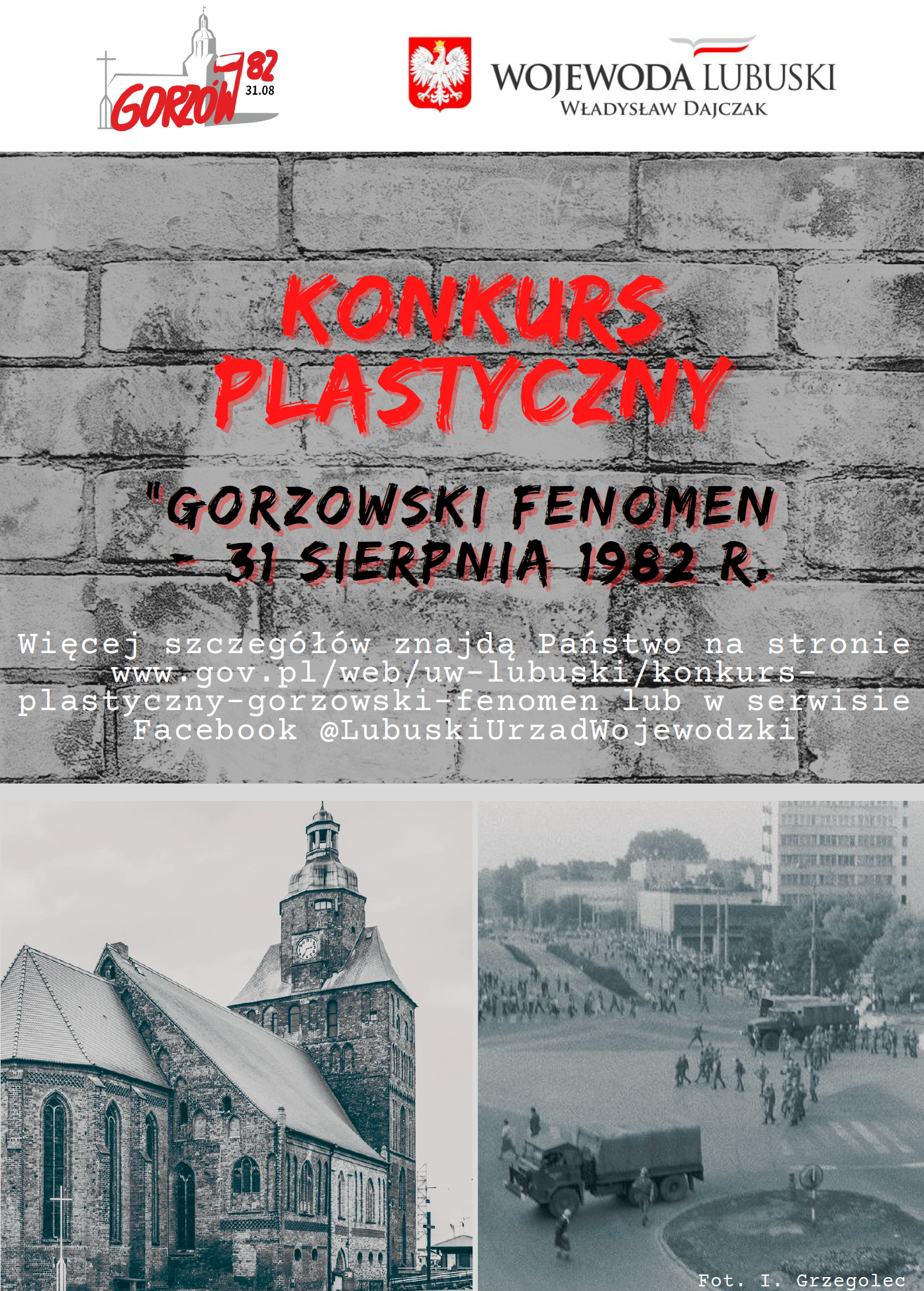 Plakat konkursowy utrzymany w szarej kolorystyce Na dole zdjęcie katedry i zdjęcie z zamieszek. Powyżej, na tle z cegieł napis: Konkurs plastyczny "Gorzowski Fenomen - 31 sierpnia 1982 r.". Więcej szczegółów znajdą Państwo na stronie www.gov.pl/uw-lubuski/Konkurs-plastyczny-lubuski-fenomen lub w serwisie Facebook @LubuskiUrzadWojewodzki