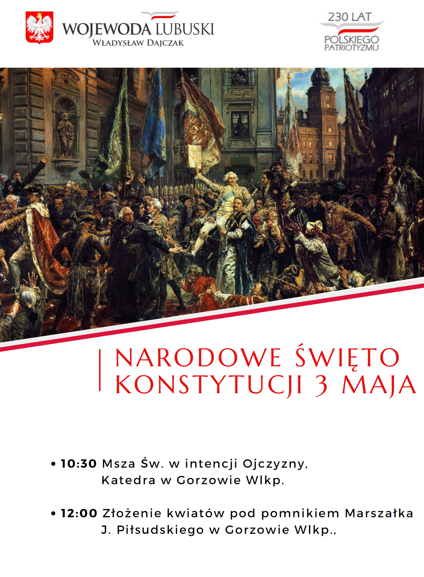 Uchwalona 230 lat temu Konstytucja stała się jednym z symboli naszej niepodległości oraz dążenia narodu do wolności i niezależności. Ta pierwsza w Europie i druga na świecie Ustawa Rządowa była dowodem wielkiego patriotyzmu jej twórców oraz głębokiego zrozumienia spraw ważnych dla wszystkich obywateli. Gdy nieco ponad sto lat temu, po latach zaborów odradzała się niepodległa Polska, rocznica uchwalenia Konstytucji 3 Maja stała się najważniejszym świętem państwowym. Poprzez godne i patriotyczne celebrowanie rocznicy ustanowienia Konstytucji 3 Maja, oddajemy hołd jej twórcom oraz patriotom, dla których dobro Ojczyzny było nadrzędną wartością.